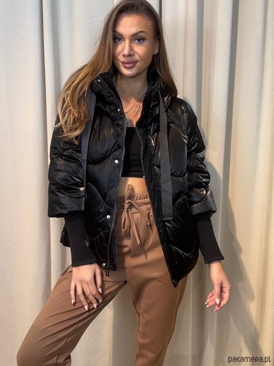 Zimowa kurtka z kapturem oraz swetrowymi rękawami.