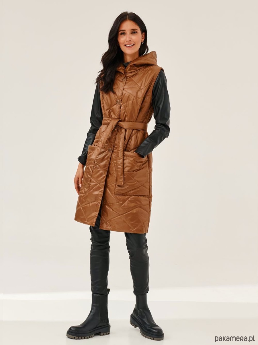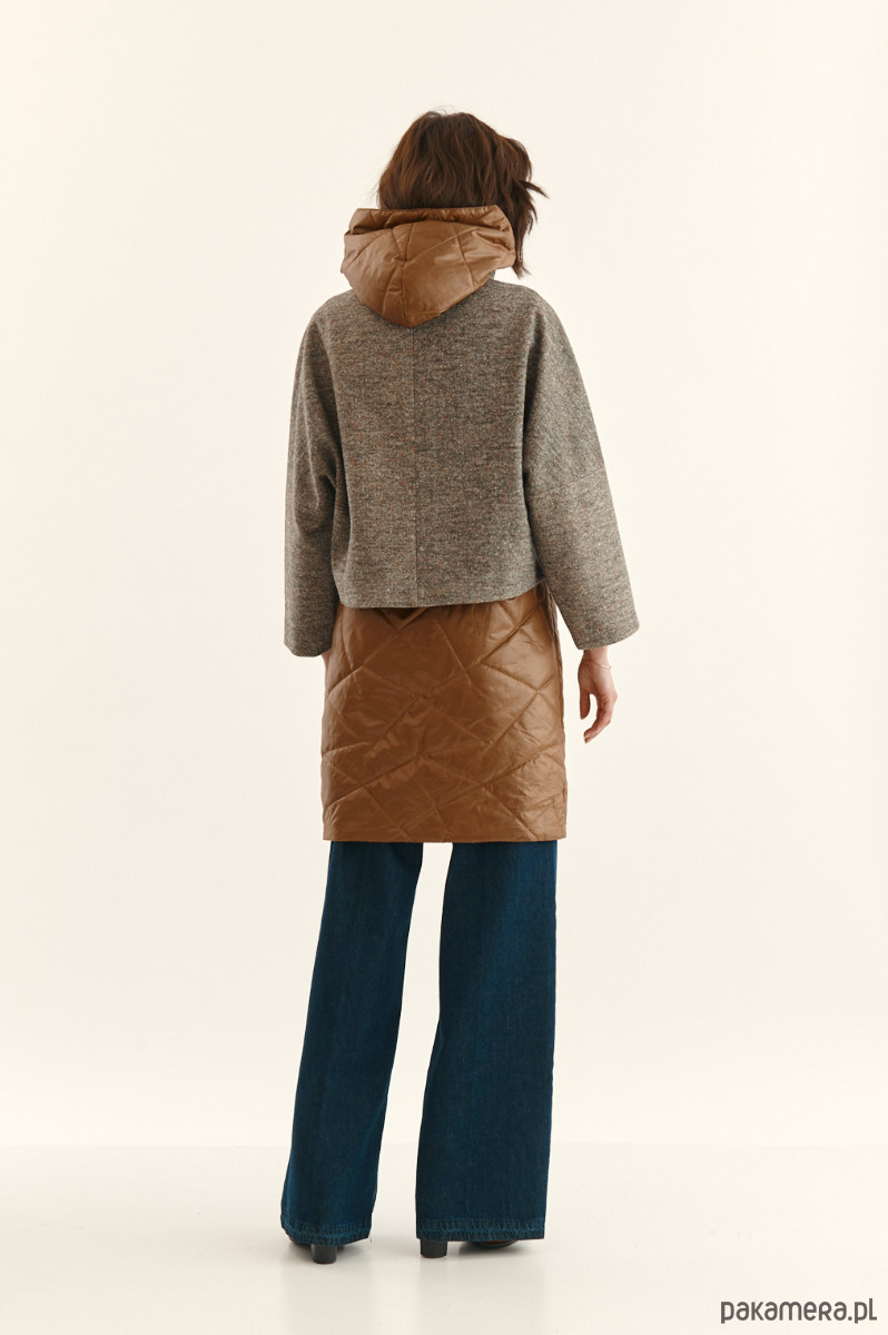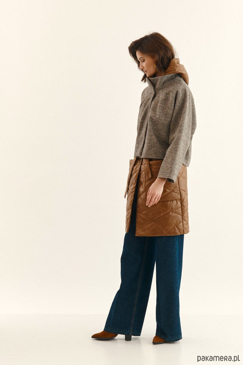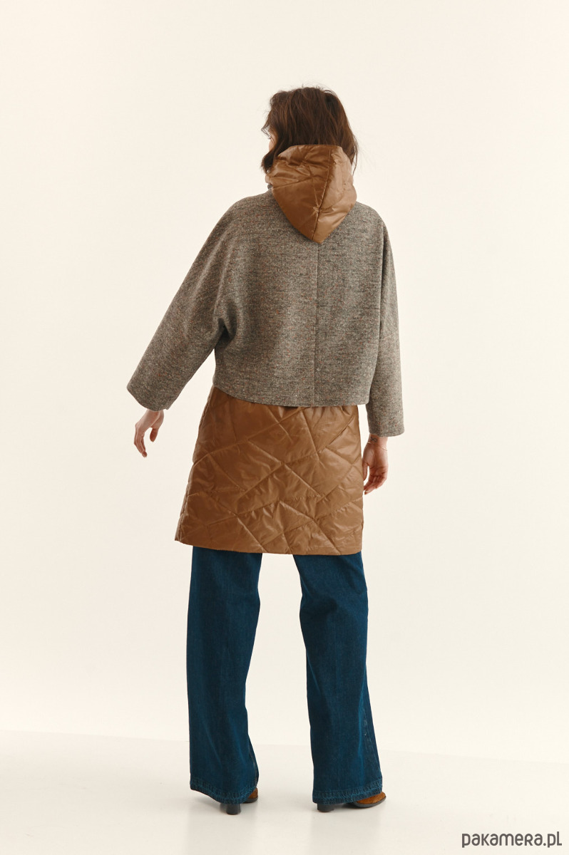 Kurtka - kamizelka ALVA to kombinacja kamizelki i kurtki. Kamizelka jest lekko ocieplana oraz jest dwustronna, jedna strona jest pikowana, druga strona jest gładka. Kamizelka jest z kapturem i ma pasek w talii. Forma kurtki to ciekawy kształt pudełka. Kurtka z melanżowego flauszu w kolorowe kropeczki. Forma kurtki to ciekawy kształt pudełka. Kurtka ma stójkę. Kurtka jest zapinana na 3 napy-springi. Kurtka od środka wykończona piękną podszewką w kolorze kamizelki.