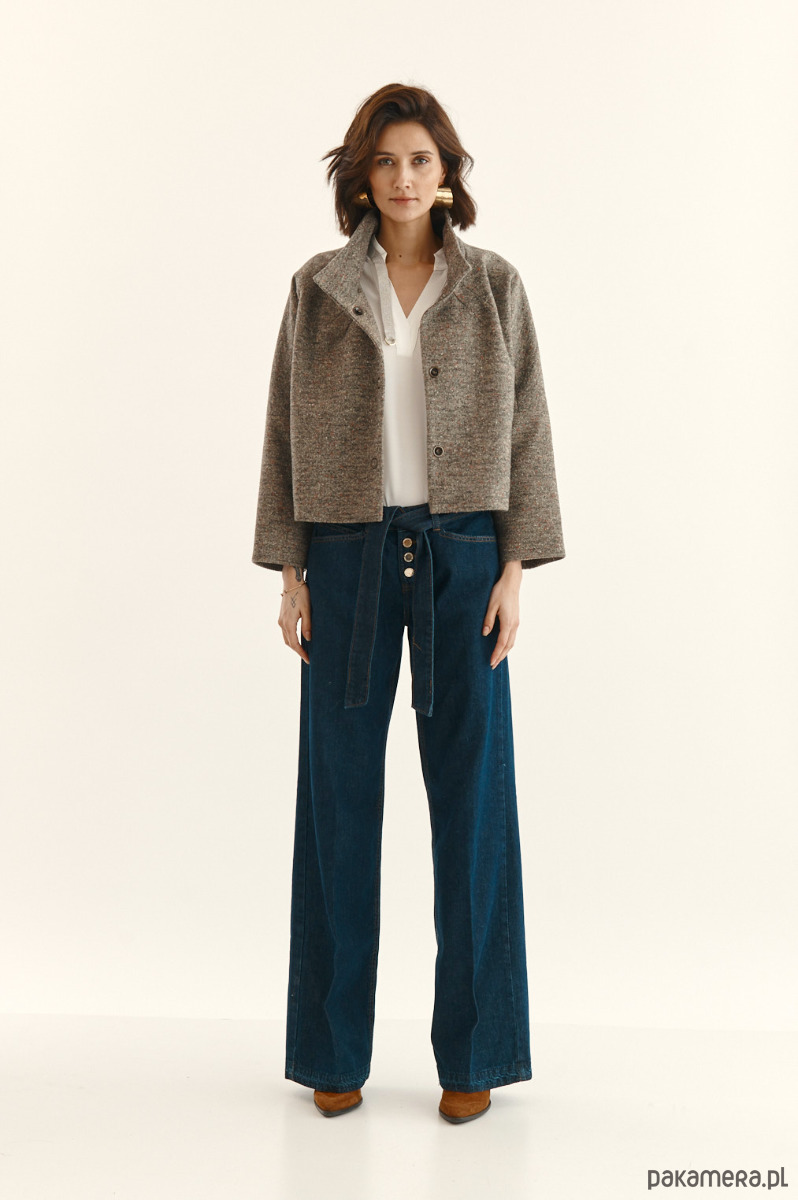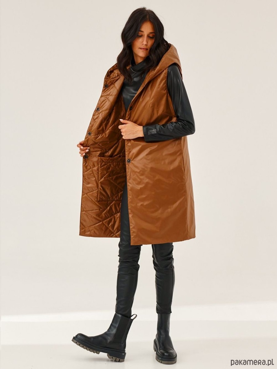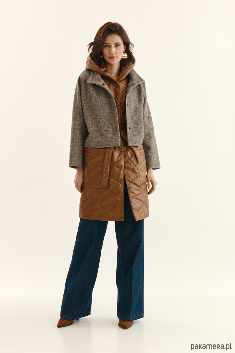 Kurtka - kamizelka ALVA to kombinacja kamizelki i kurtki. Kamizelka jest lekko ocieplana oraz jest dwustronna, jedna strona jest pikowana, druga strona jest gładka. Kamizelka jest z kapturem i ma pasek w talii. Forma kurtki to ciekawy kształt pudełka. Kurtka z melanżowego flauszu w kolorowe kropeczki. Forma kurtki to ciekawy kształt pudełka. Kurtka ma stójkę. Kurtka jest zapinana na 3 napy-springi. Kurtka od środka wykończona piękną podszewką w kolorze kamizelki.
