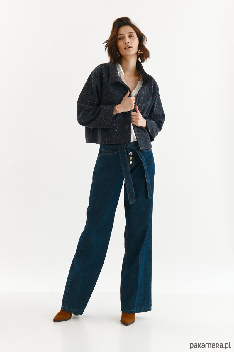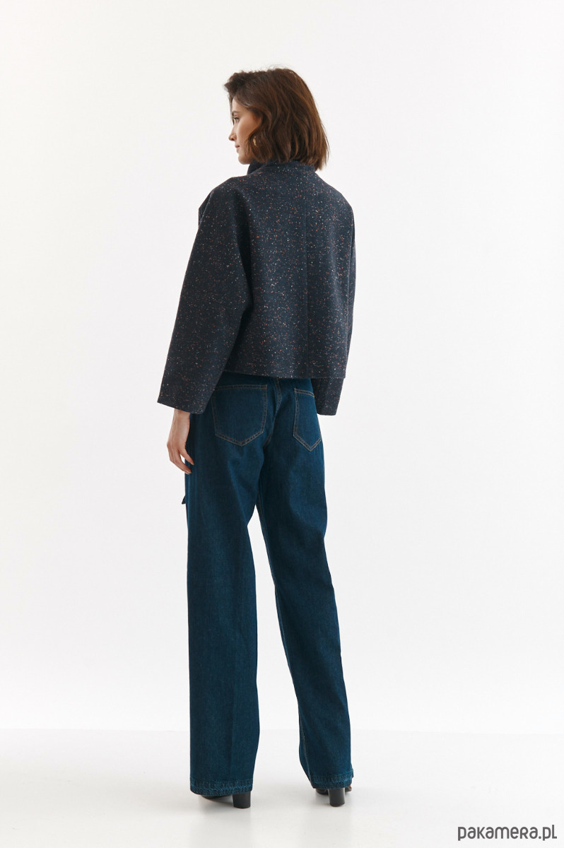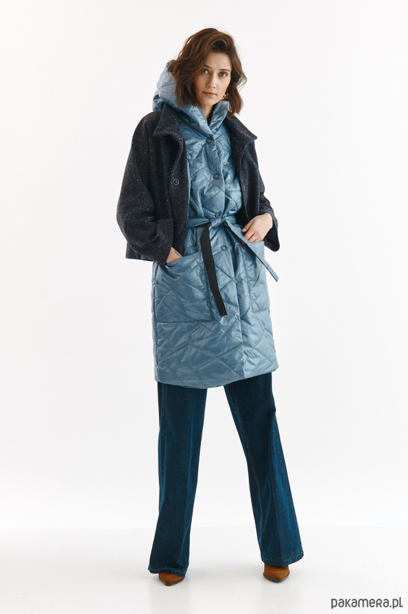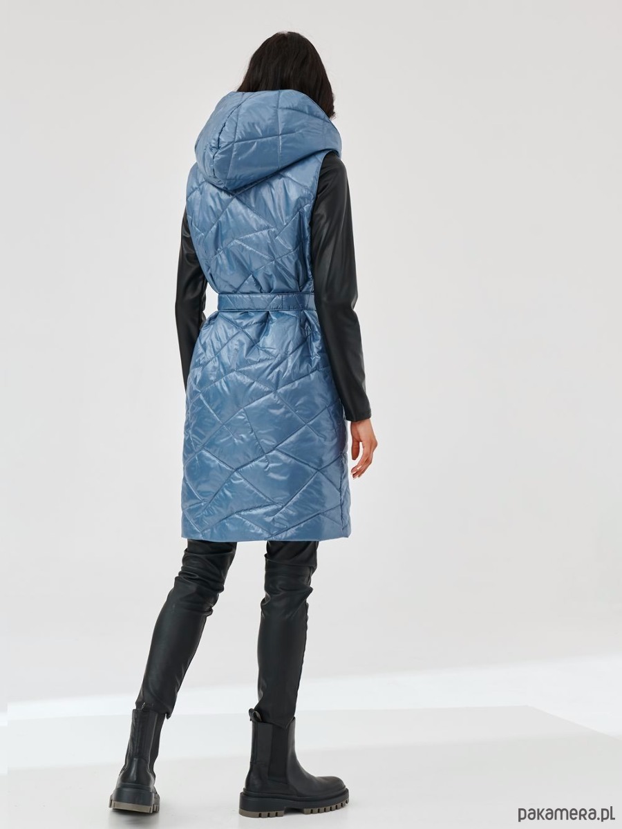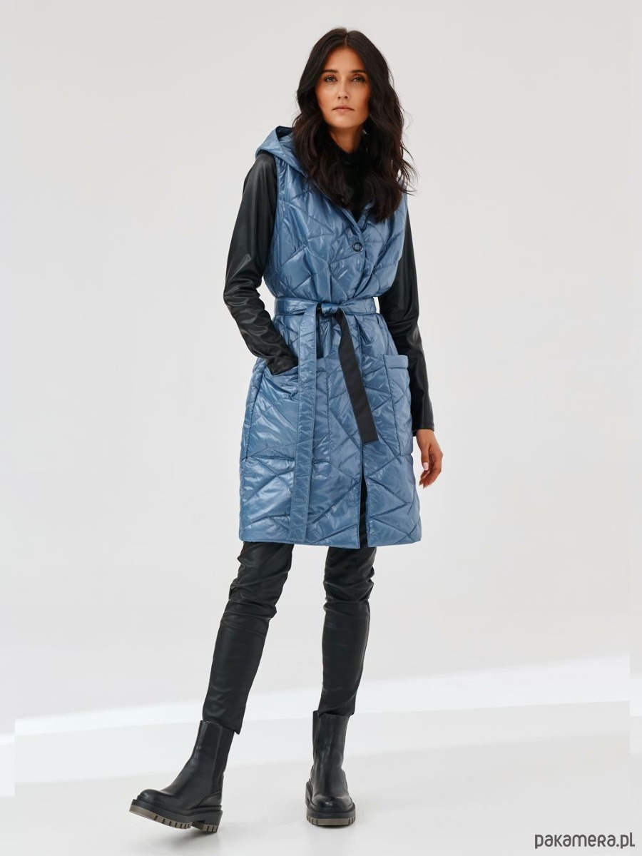 Kurtka - kamizelka ALVA to kombinacja kamizelki i kurtki, dając możliwość kombinacji 3 w 1. Kamizelka jest lekko ocieplana oraz jest dwustronna, jedna strona jest pikowana, druga strona jest gładka. Kamizelka jest z kapturem i ma pasek w talii. Forma kurtki to ciekawy kształt pudełka. Kurtka z melanżowego flauszu w kolorowe kropeczki. Forma kurtki to ciekawy kształt pudełka. Kurtka ma stójkę. Kurtka jest zapinana na 3 napy-springi. Kurtka od środka wykończona piękną podszewką w kolorze kamizelki.
