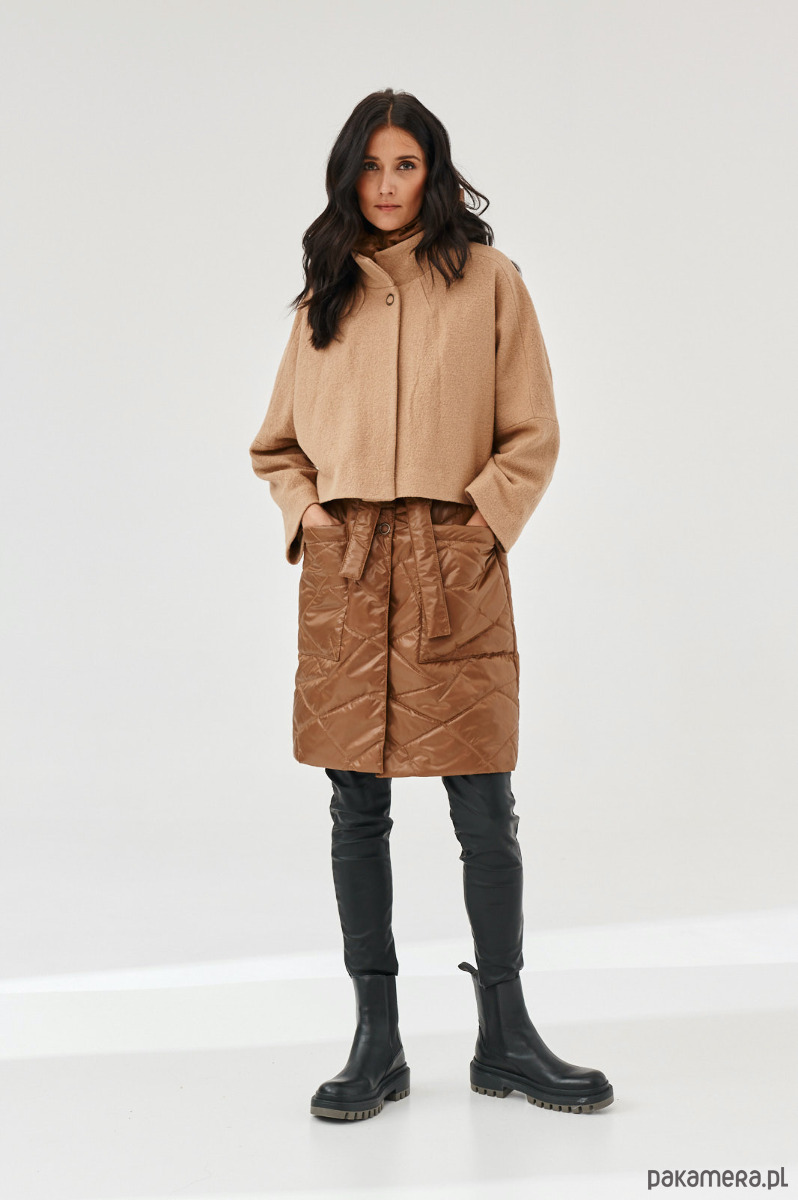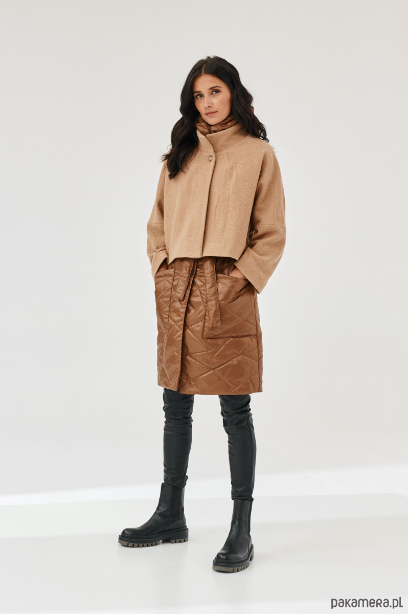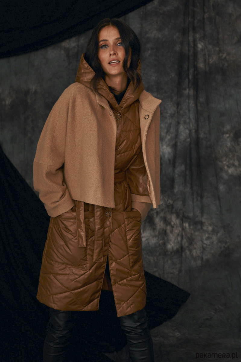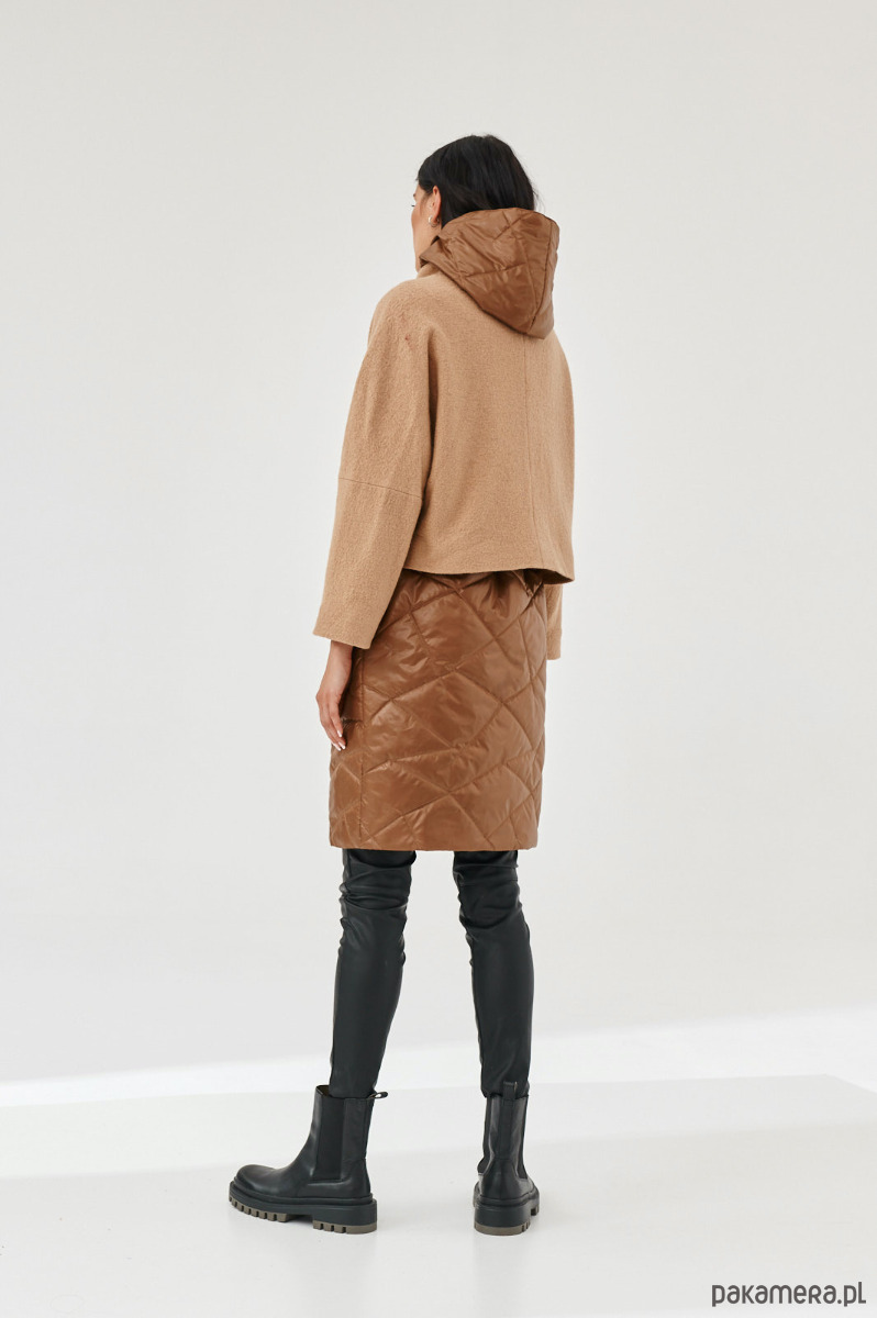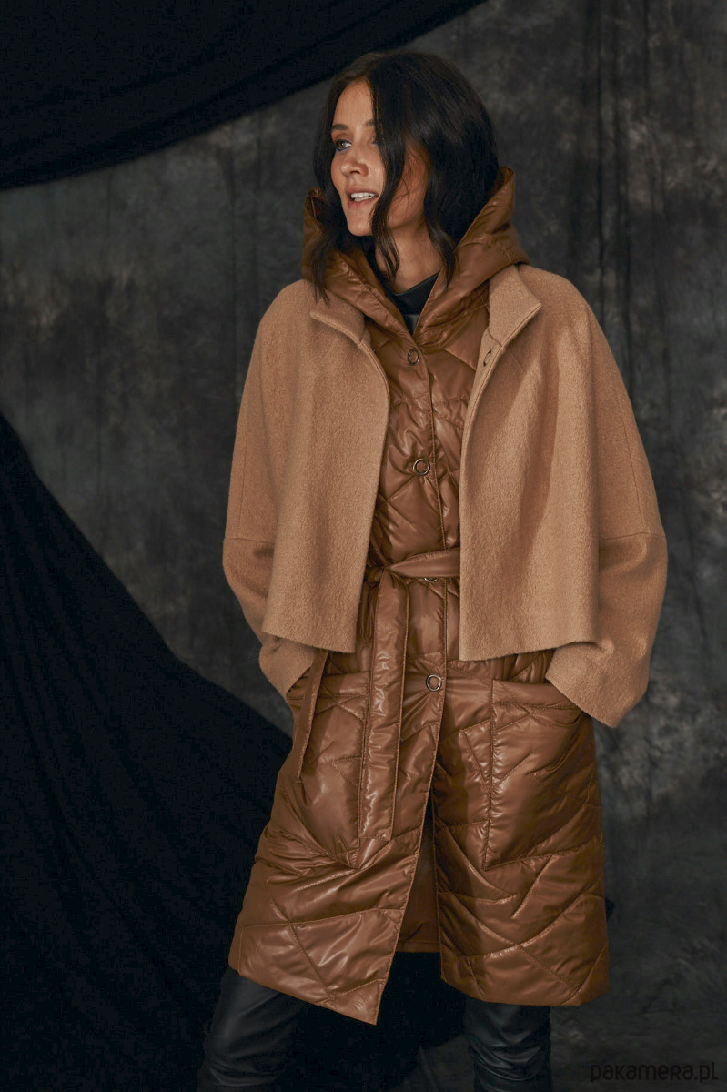 Kurtka - kamizelka ALVA to kombinacja kamizelki i kurtki, dając możliwość kombinacji 3 w 1. Kamizelka jest lekko ocieplana oraz jest dwustronna, jedna strona jest pikowana, druga strona jest gładka. Kamizelka jest z kapturem i ma pasek w talii. Forma kurtki to ciekawy kształt pudełka. Kurtka z melanżowej wełny. Forma kurtki to ciekawy kształt pudełka. Kurtka ma stójkę. Kurtka jest zapinana na 1 napy-springi. Kurtka od środka wykończona piękną podszewką w kolorze kamizelki.