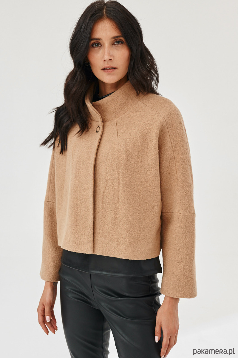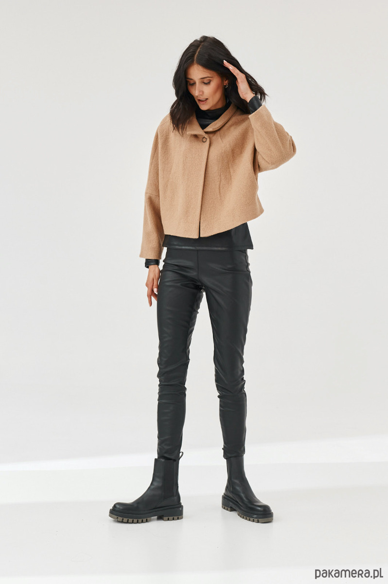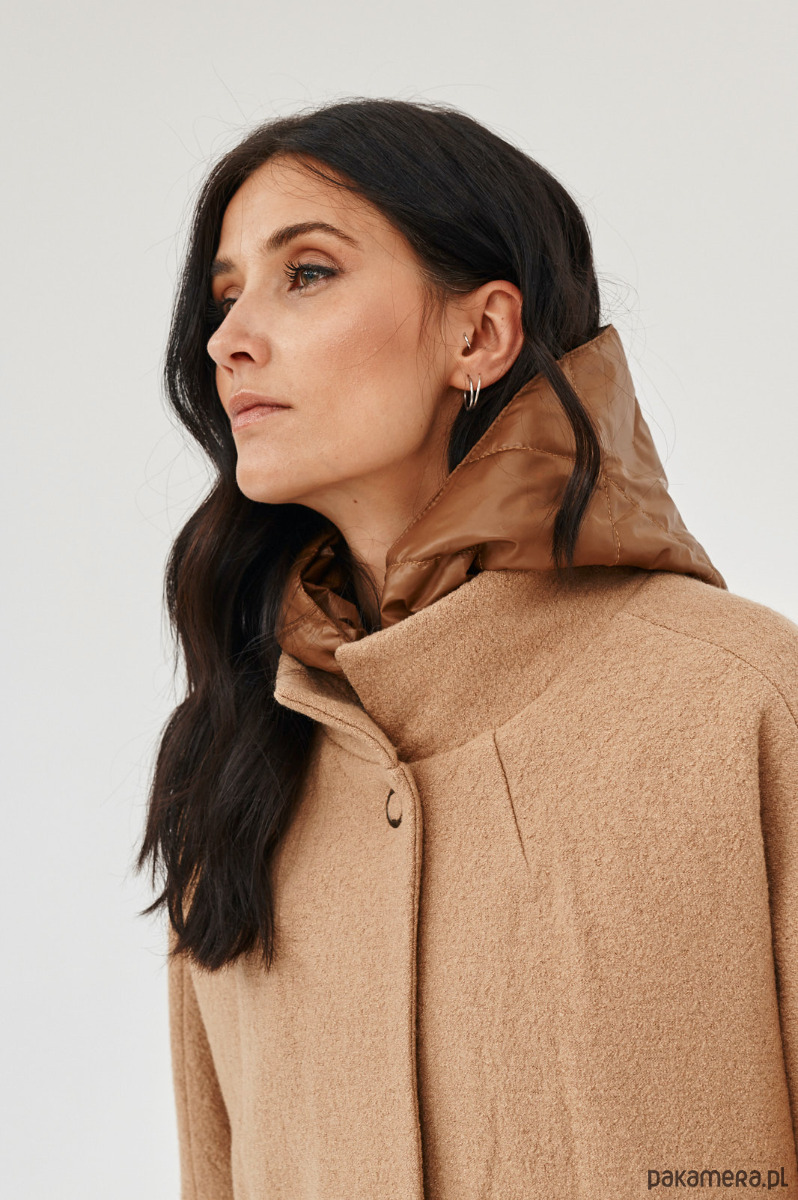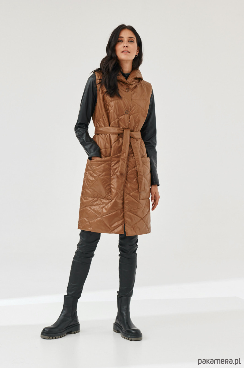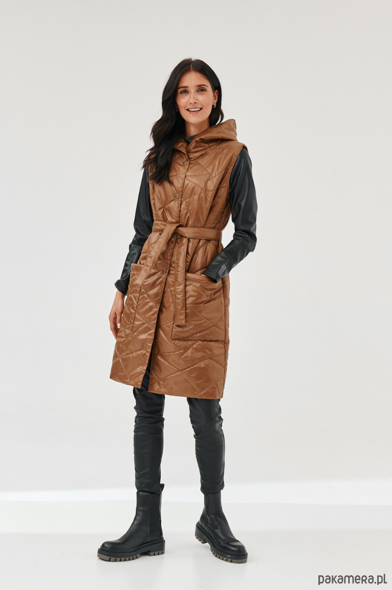 Kurtka - kamizelka ALVA to kombinacja kamizelki i kurtki, dając możliwość kombinacji 3 w 1. Kamizelka jest lekko ocieplana oraz jest dwustronna, jedna strona jest pikowana, druga strona jest gładka. Kamizelka jest z kapturem i ma pasek w talii. Forma kurtki to ciekawy kształt pudełka. Kurtka z melanżowej wełny. Forma kurtki to ciekawy kształt pudełka. Kurtka ma stójkę. Kurtka jest zapinana na 1 napy-springi. Kurtka od środka wykończona piękną podszewką w kolorze kamizelki.