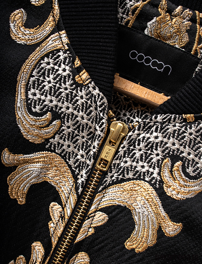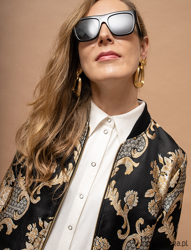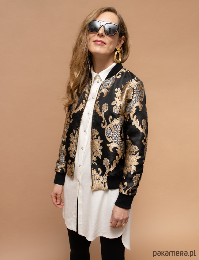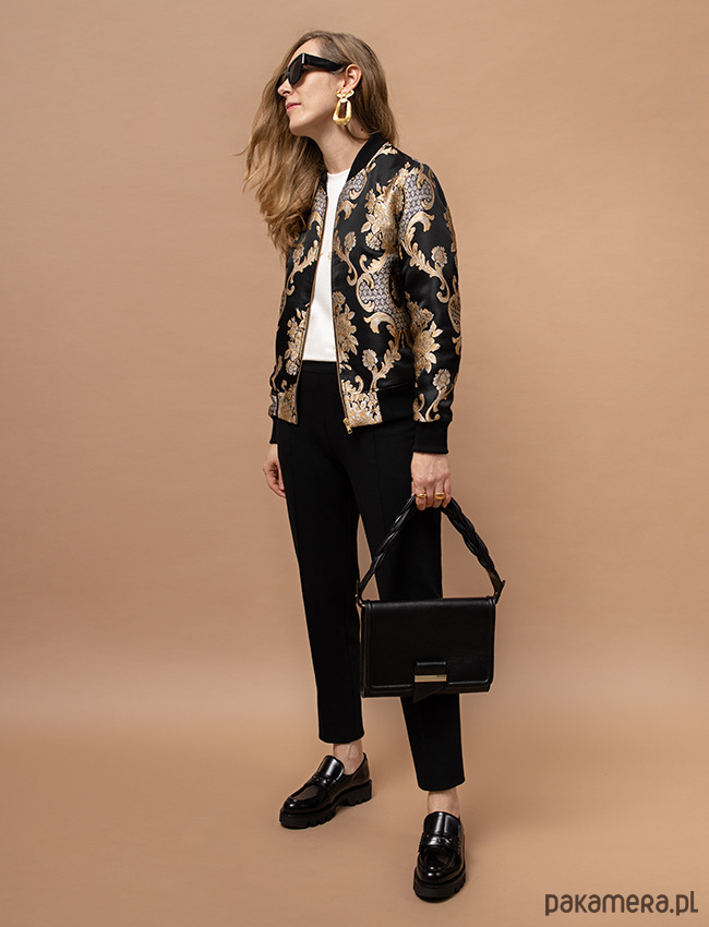 Elegancka bomberka z tkaniny żakardowej o satynowym wykończeniu, w kolorze czerni i złota. To co się rzuca najbardziej w oczy to przepiękny wypukły haft w barokowym stylu z motywami roślinnymi. Jest to prawdziwy tkacki majstersztyk, który nadaje jej oryginalnego i niepowtarzalnego charakteru. Bomberki różnią się układem wzoru. Z powodzeniem może zastąpić marynarkę w biznesowych stylizacjach i nie tylko. Dekolt, dół i rękawy wykończone bawełnianym ściągaczem. W całości od spodu odszyta podszewką. Bomberki różnią się układem wzoru. Produkt uszyty w Polsce w małych rzemieślniczych zakładach krawieckich.
