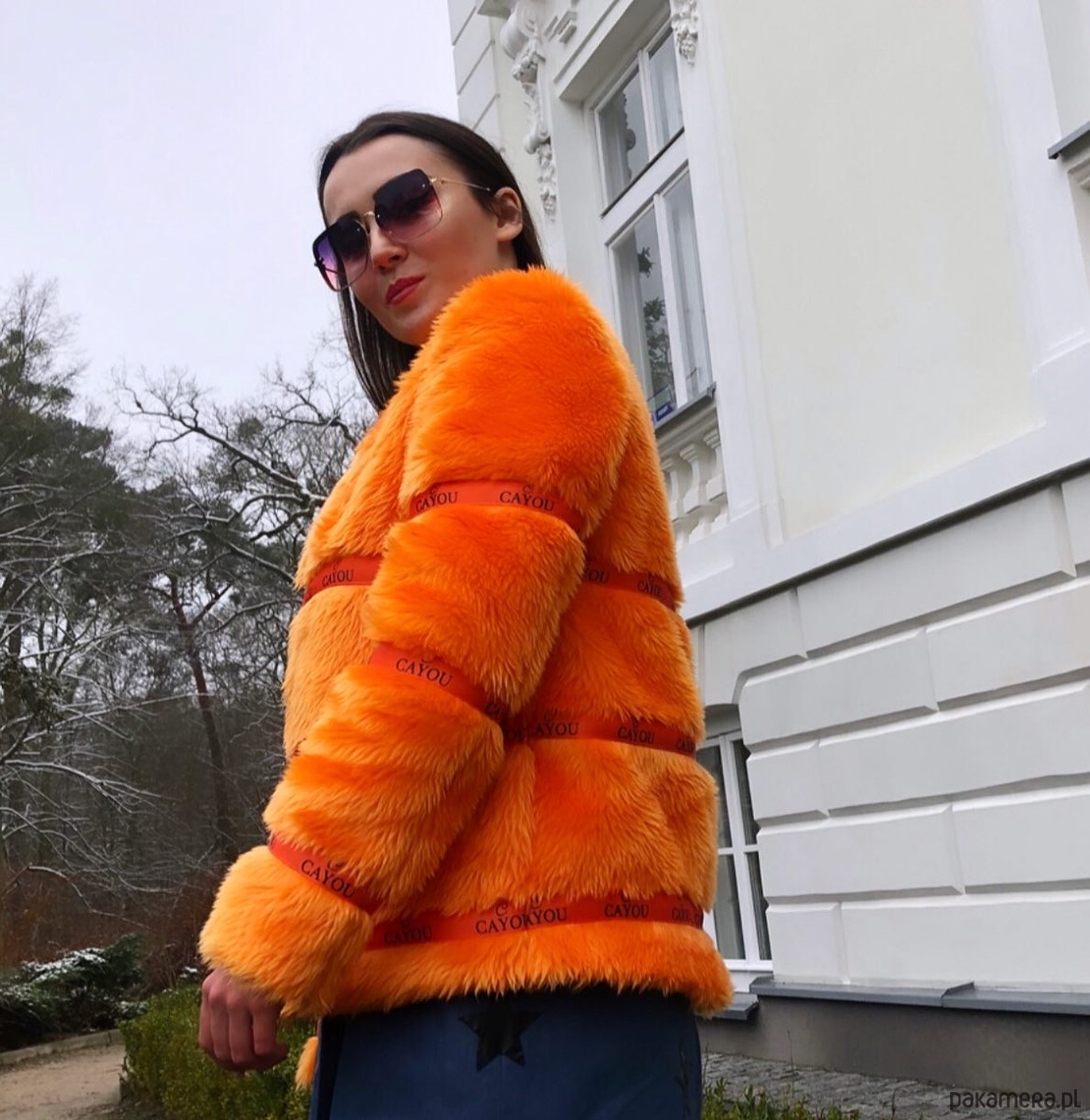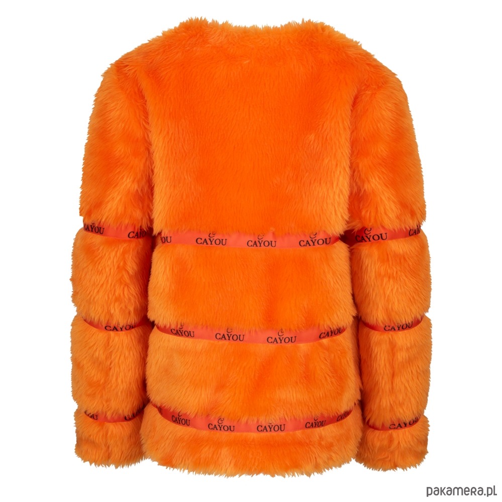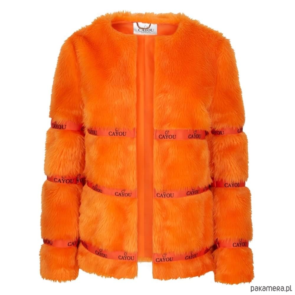 -eko futerko w intensywnym pomarańczowym kolorze z logowanymi taśmami zapinany na czarne haftki