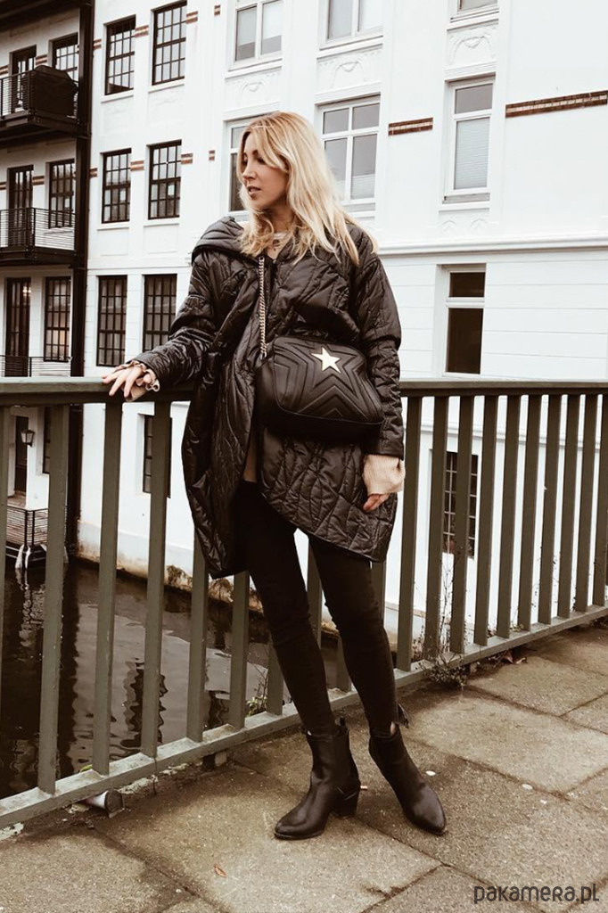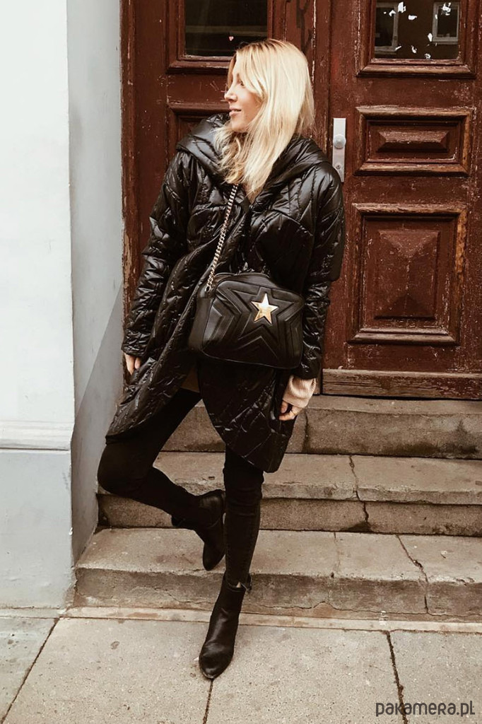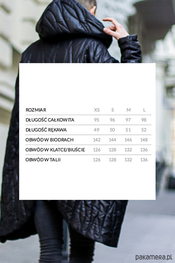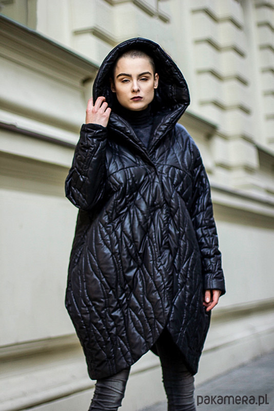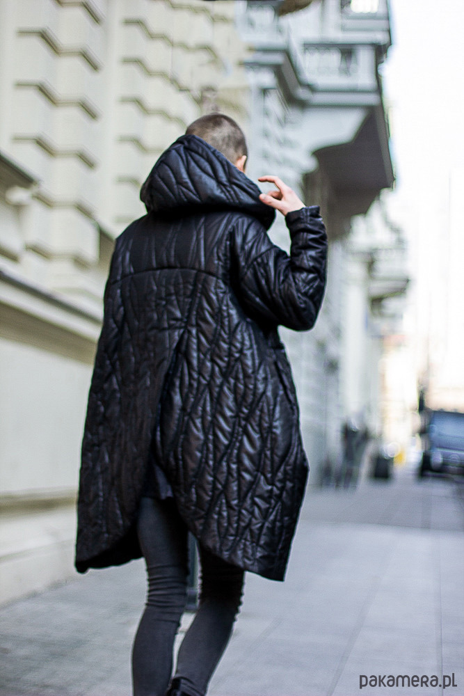 Oversizowa kurtka z kapturem. Szerokie rękawy, obniżona linia ramion. Uszyta z czarnego materiału, pikowanego w motyw "kory". Zapinana na napy. Kieszenie w bocznych szwach.