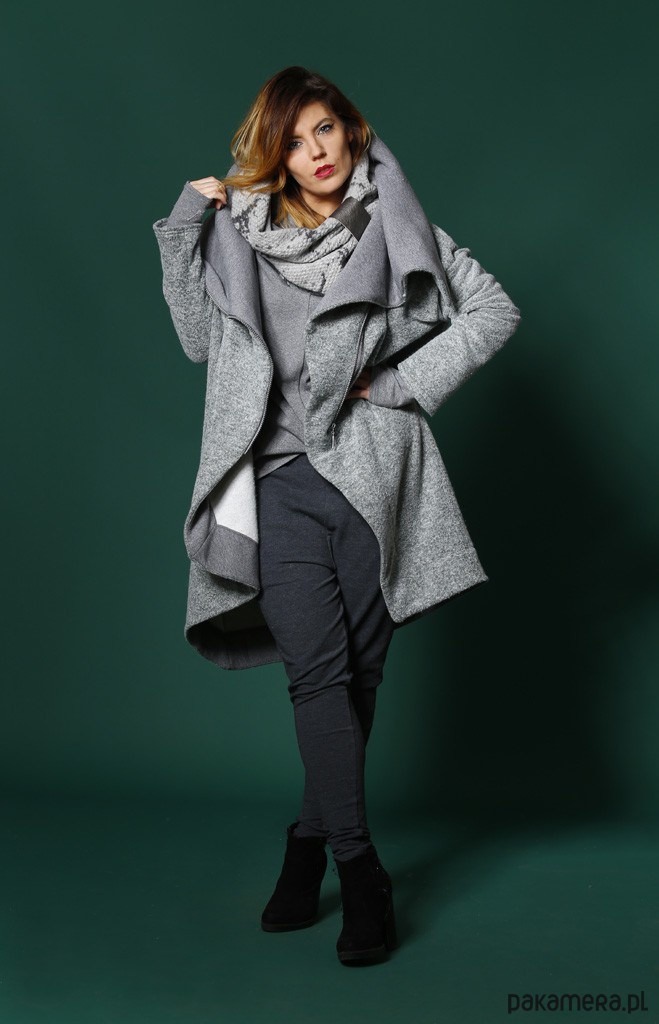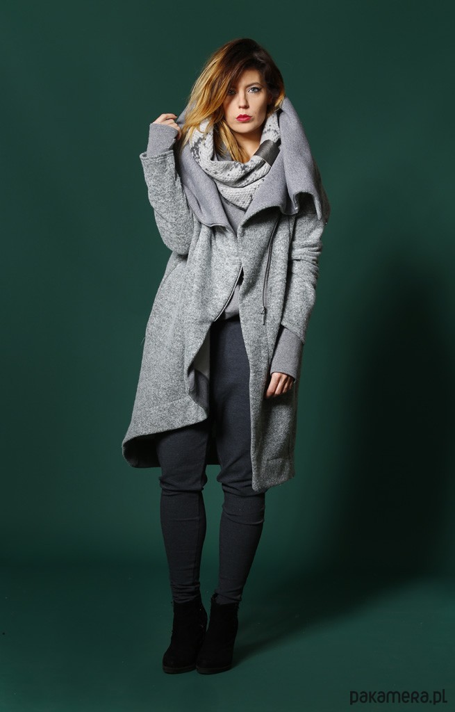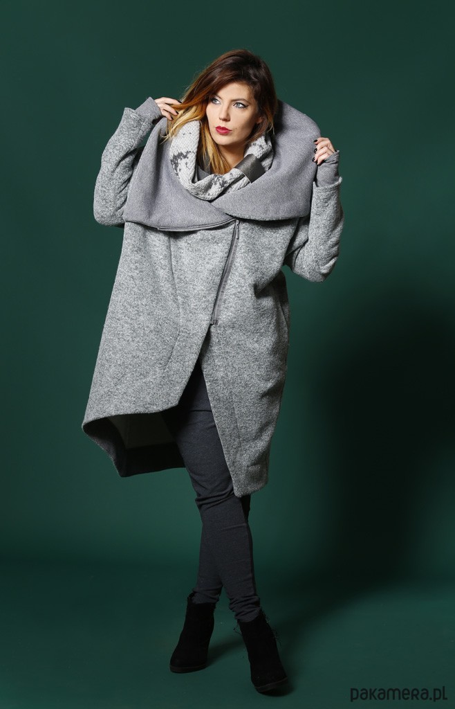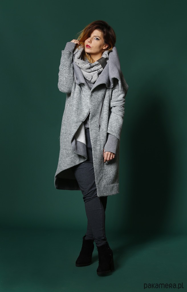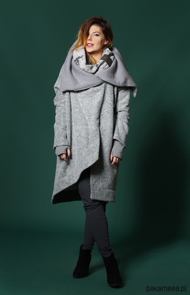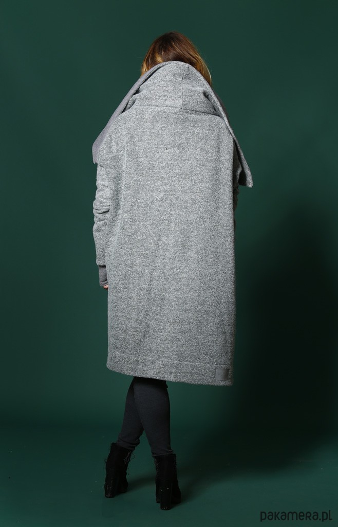 NUBEE - ASYMMETRY HOOD płaszcz wykonany z dzianiny swetrowej, z kołnierzem, zapinany na ekspress.Cechą charakterystyczną modelu jest asymetryczny przód zakładanych na siebie części. Kieszenie ukryte w szwach bocznych. Wykończenia z dzianiny grafitowej. Płaszcz jest obrandowany metkami z skóry ekologicznej z tłoczonym logo nubee. WYMIARY: OneSize pasuje na:S/M/L/XL - długość całkowita: 90 cm - rękaw 7/8 PRZEPIS PRANIA: prać w pralce w temperaturze do 30 st. C w dobrych środkach piorących, można odwirować