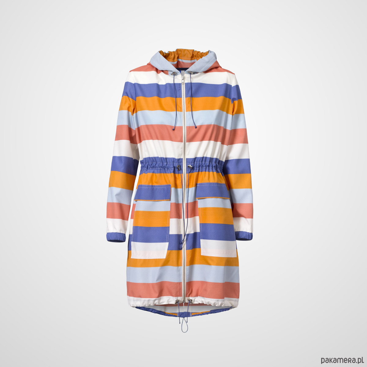 Kurtka typu parka z włoskiego ortalionu w kolorowe pasy, ściągana sznurkiem w trzech miejscach (kaptur, pas i u dołu) - rękawy ściągnięte gumą - kaptur - tkanina nieprzemakalna chroni od wiatru i deszczu, nie elektryzuję się