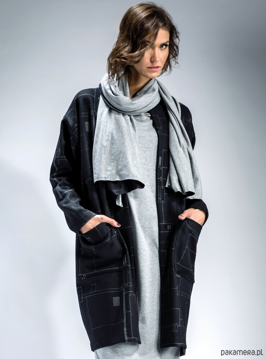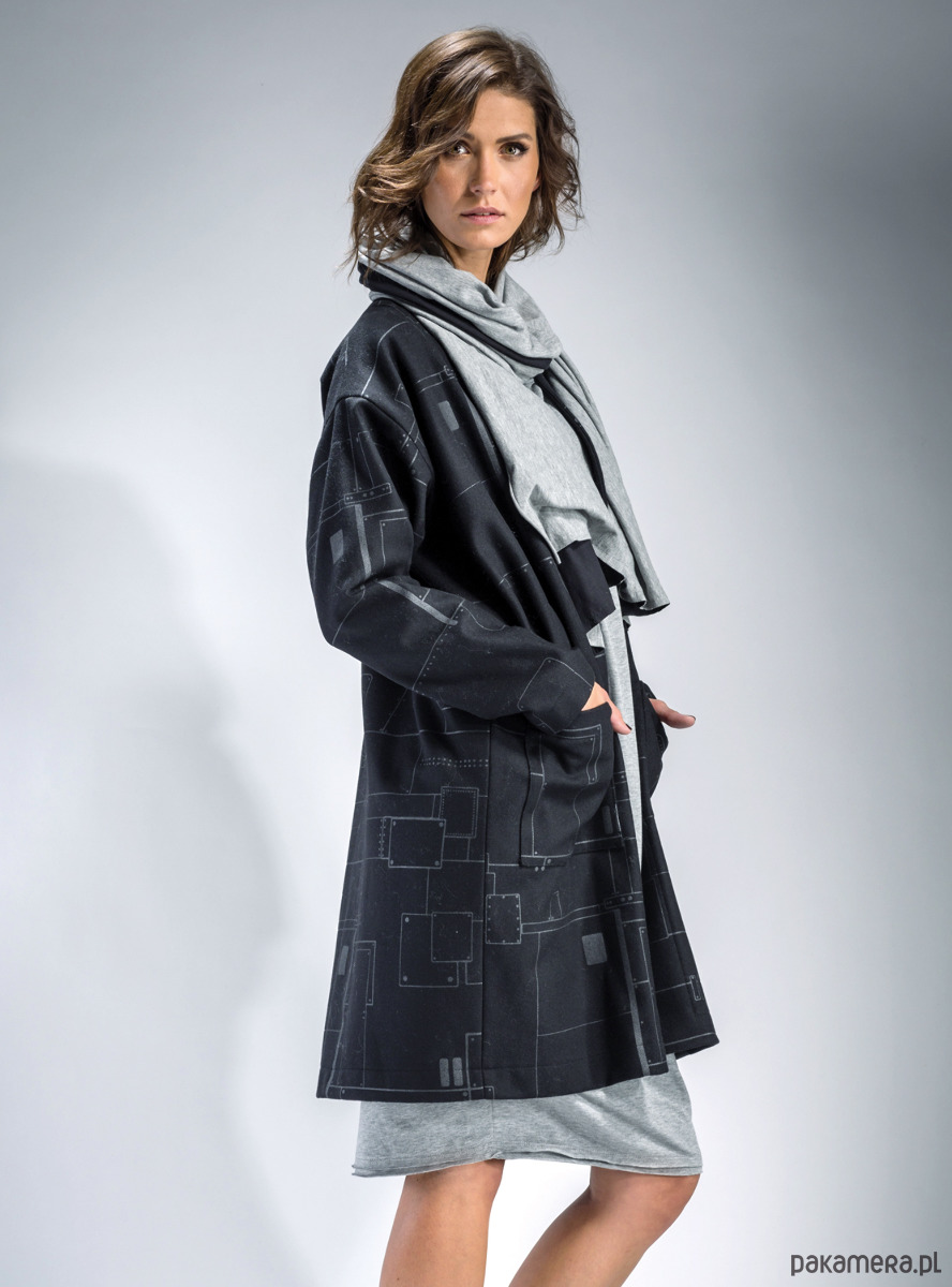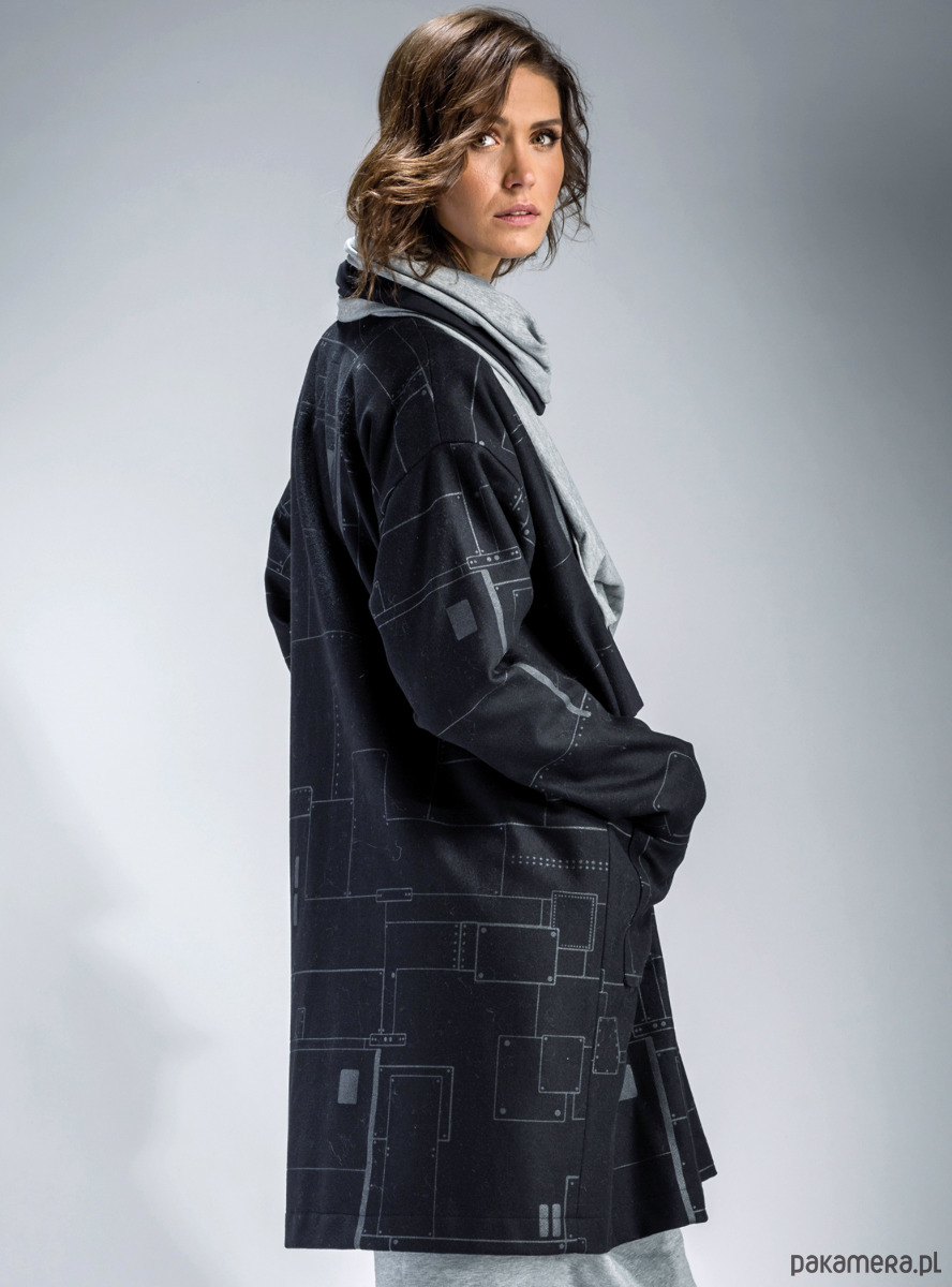 Elegancki płaszcz do kolan. Usztyty z czarnej wełny, w graficzny nadruk.