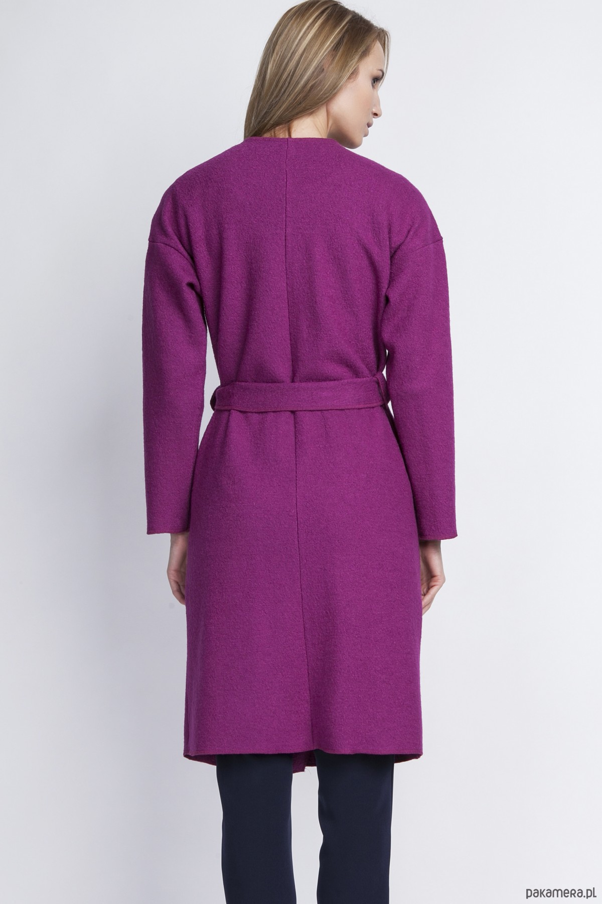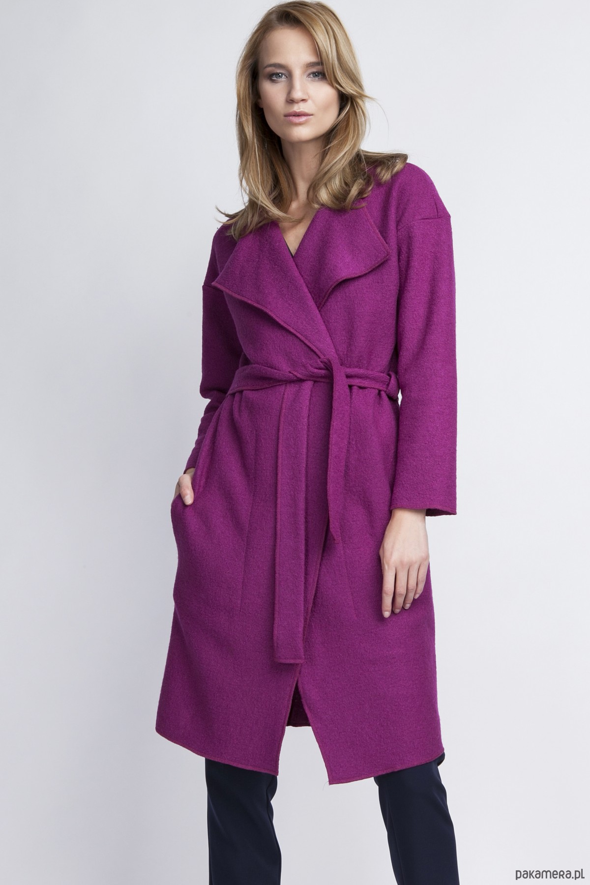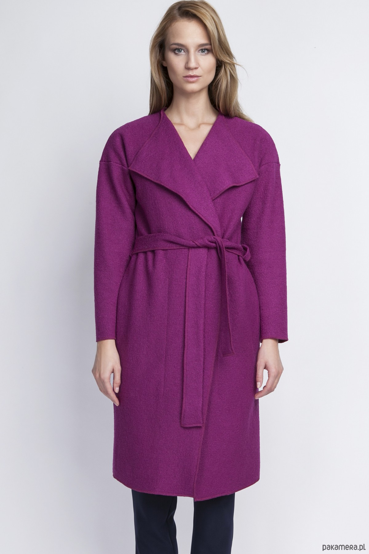 Szlafrokowy płaszcz przewiązywany w talii paskiem.