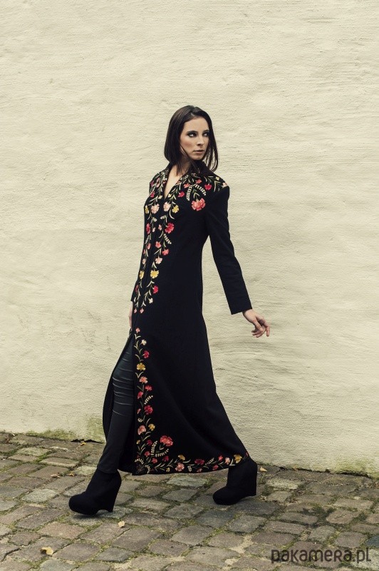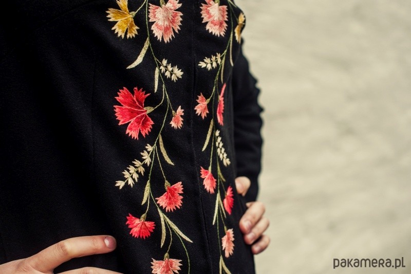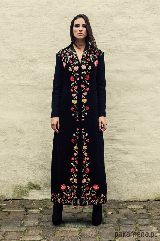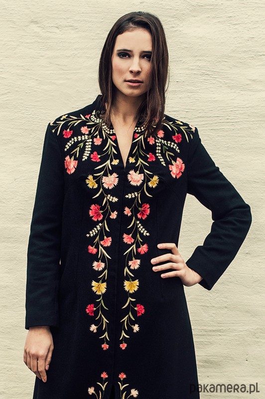 Długi, wełniany płaszcz o prostym kroju, z pięknym, ręcznie haftowanym, kwiatowym ornamentem. Jest połączeniem eleganckiego i wyrafinowanego stylu z bogatą ornamentyką motywów ludowych. Płaszcz jest unikatowy, to jedyny egzemplarz. Został wykonany z materiałów vintage, w doskonałym stanie i najwyższej jakości. Wymiary: długość przodu 141,5 cm; długość rękawa 57 cm; szerokość ramion 44 cm; obwód biustu 92 cm; obwód talii 82 cm; obwód bioder 94 cm. Odpowiednik rozmiaru S/M.