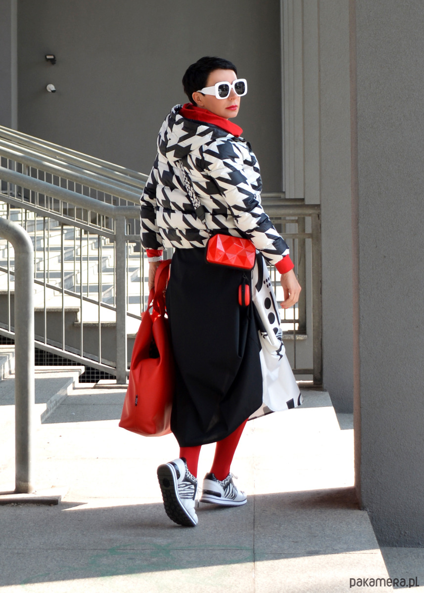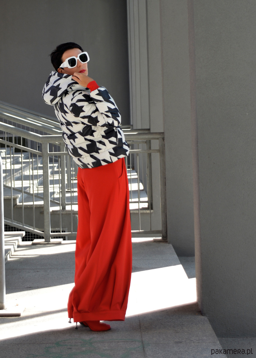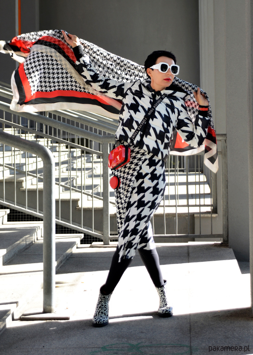 krótka kurtka z naturalnego puchu w duży wzór pepitka