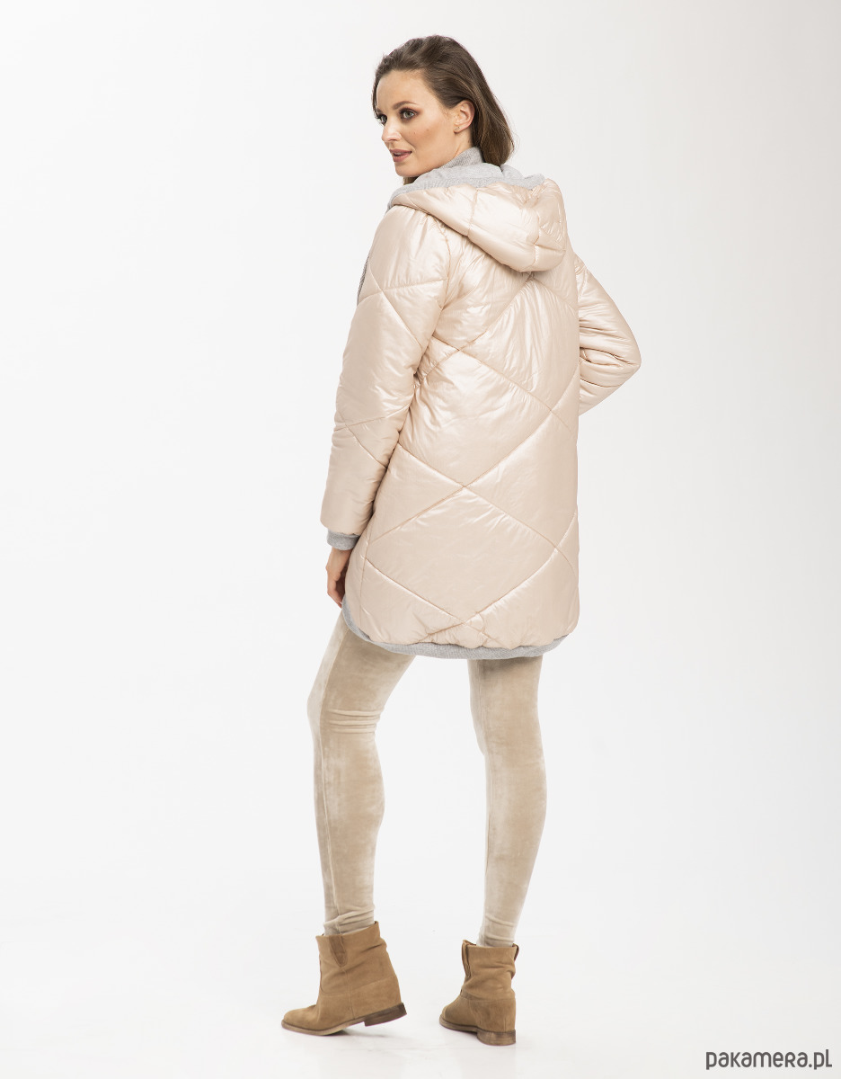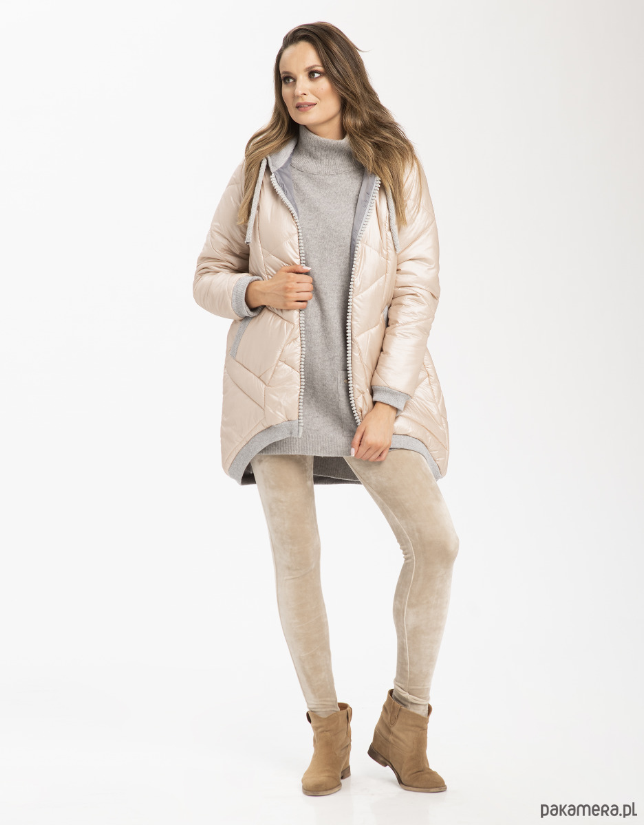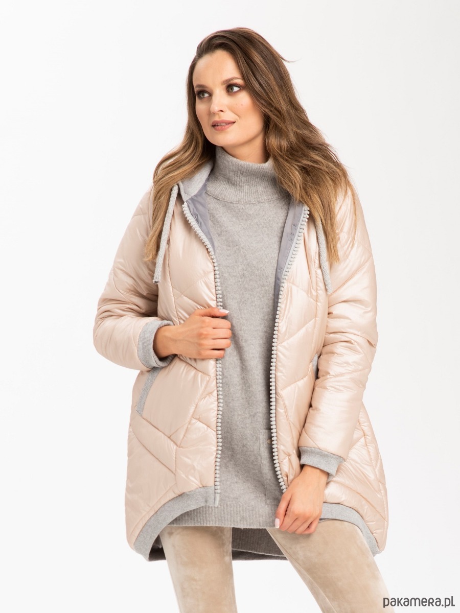 Kobieca, pudrowa i ciepła pikowana kurtka z kapturem i kieszeniami. Kolorystyka została tak skomponowana byś czuła się w niej komfortowo i z łatwością dopasowała do pozostałych części garderoby w swojej kapsułowej szafie - miękki, pudrowy odcień lekko różowego beżu z połyskiem plus popielate dodatki.