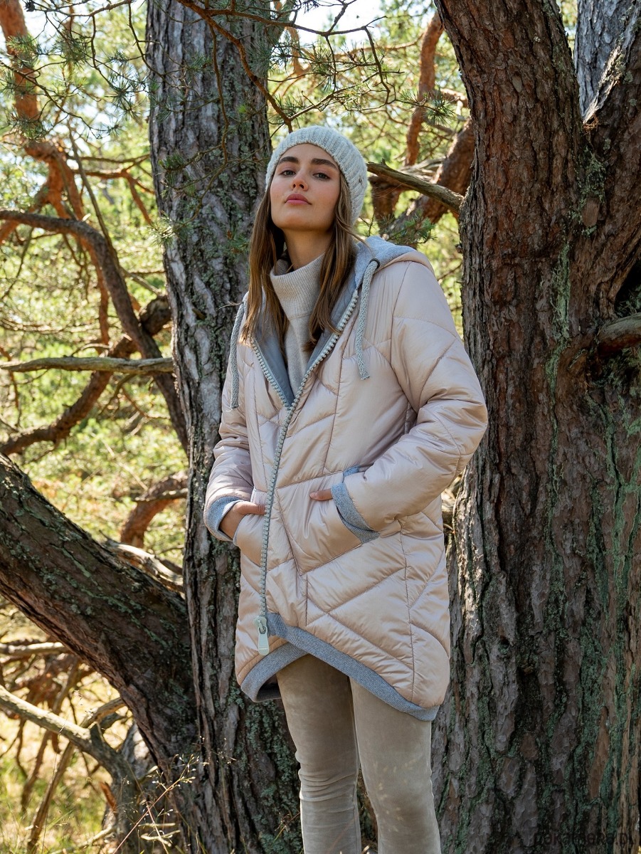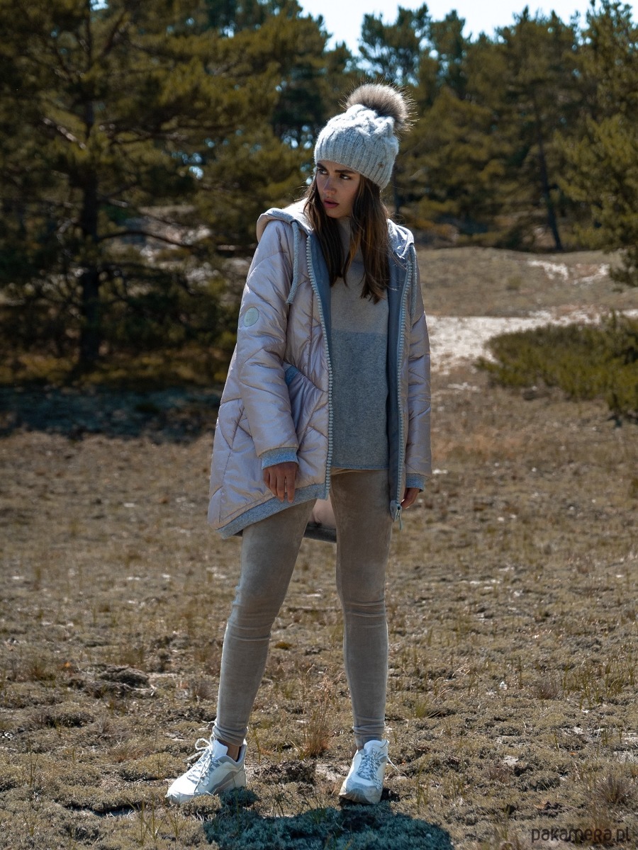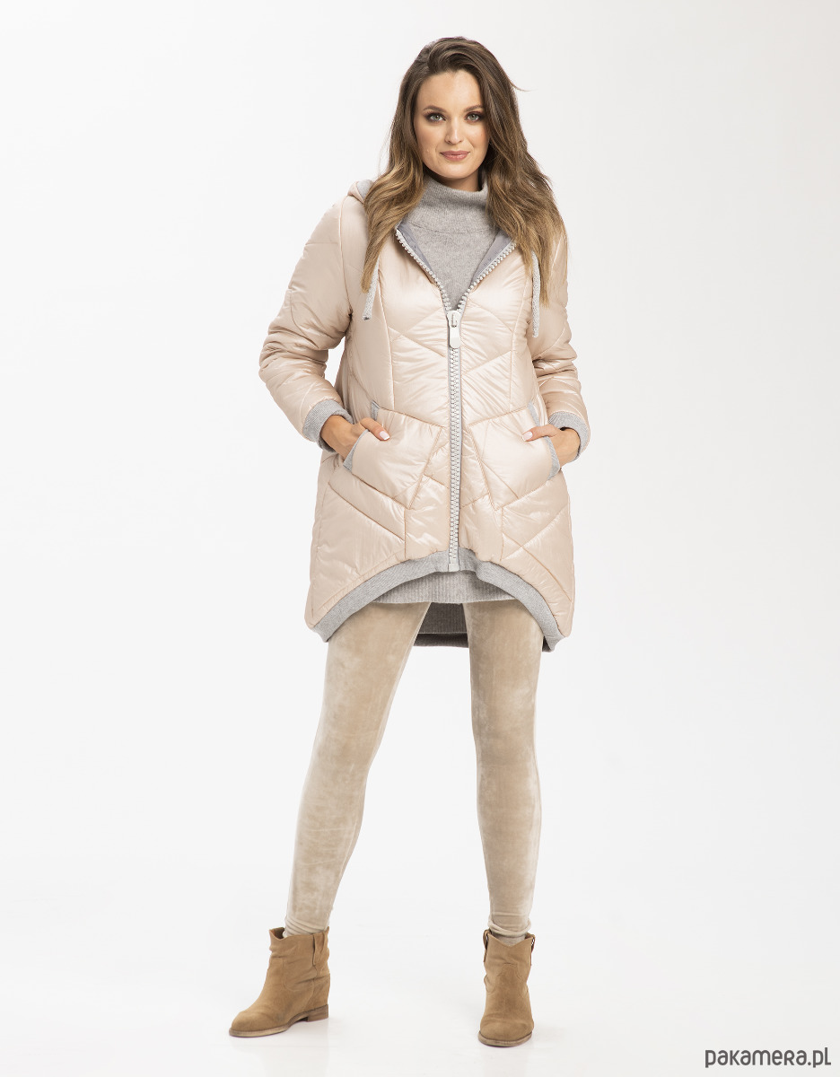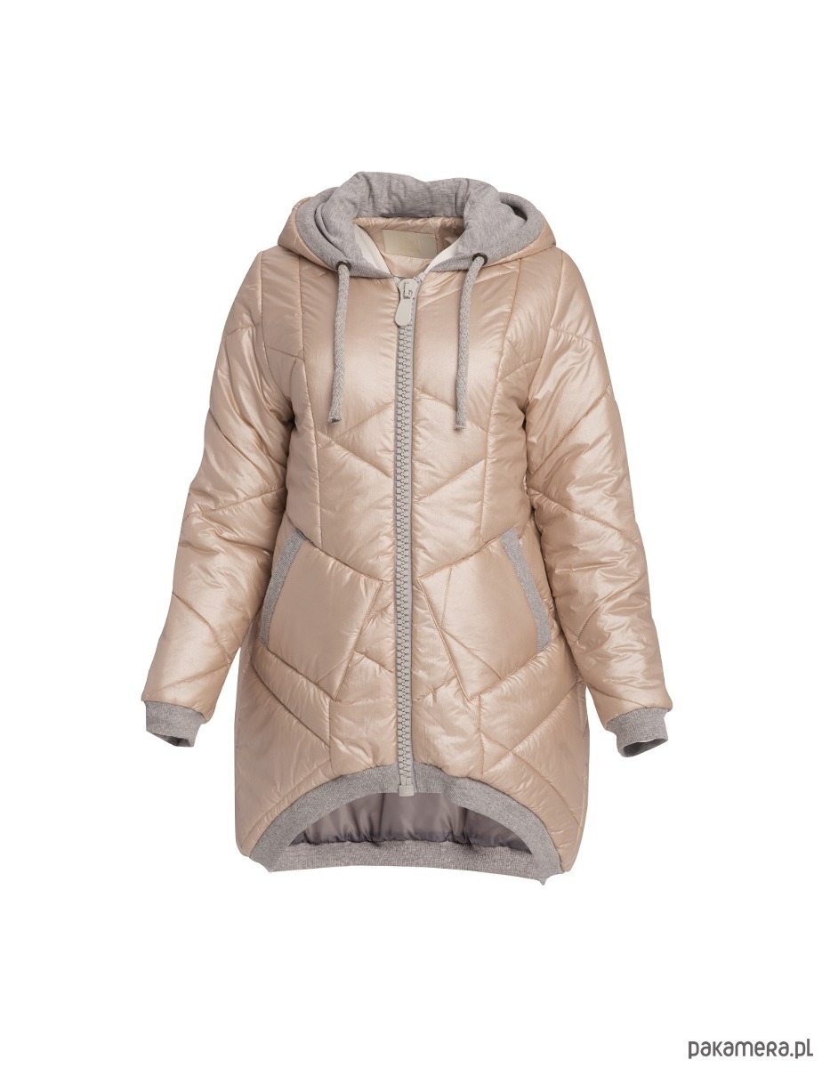 Kobieca, pudrowa i ciepła pikowana kurtka z kapturem i kieszeniami. Kolorystyka została tak skomponowana byś czuła się w niej komfortowo i z łatwością dopasowała do pozostałych części garderoby w swojej kapsułowej szafie - miękki, pudrowy odcień lekko różowego beżu z połyskiem plus popielate dodatki.