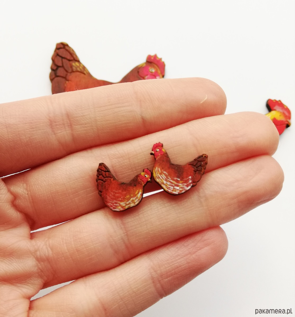 Kolczyki wykonane według autorskiego rysunku z drewna i ręcznie malowana, następnie lakierowana. Każda para będzie niepowtarzalna. Wielkość ok. 1.5cm