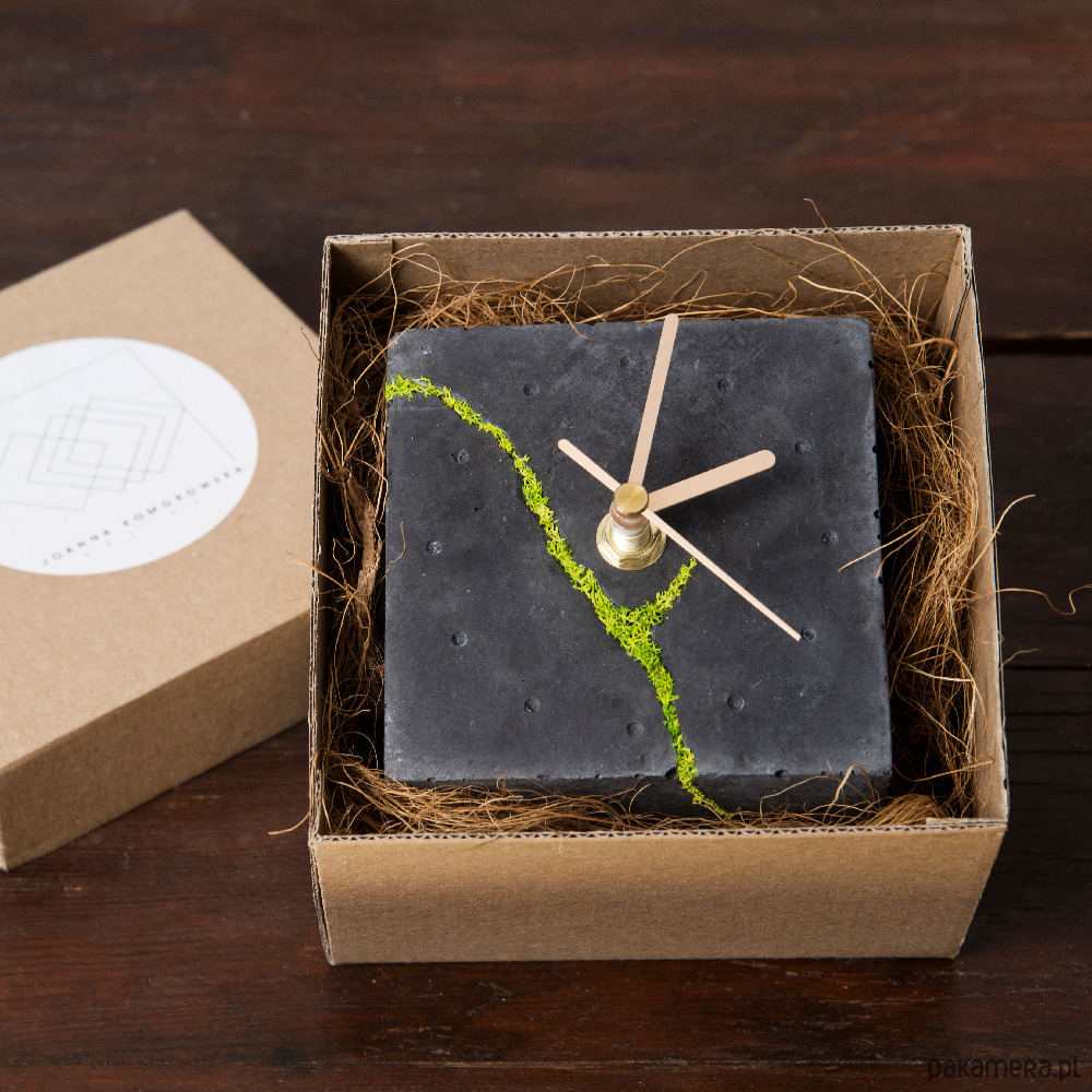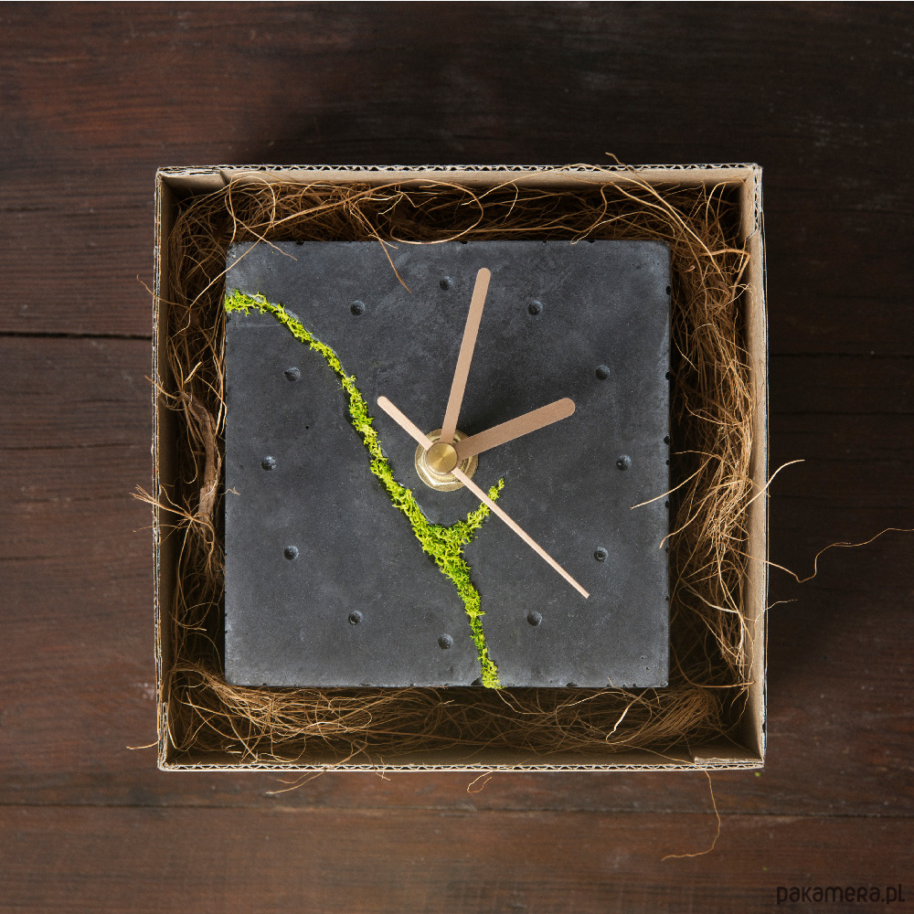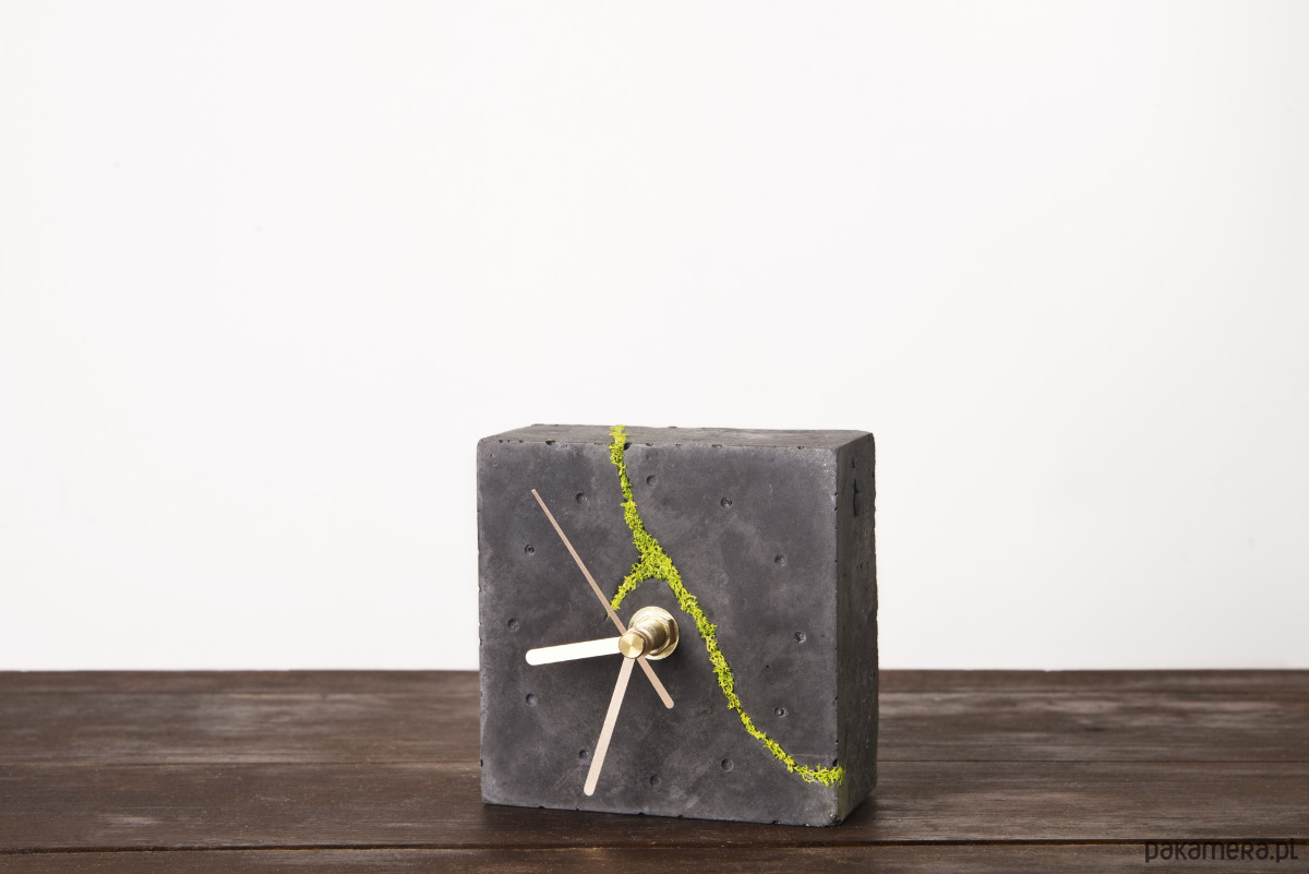 Zegar ręcznie wykonany z betonu architektonicznego barwionego na kolor ciemnografitowy, z chrobotkiem reniferowym umieszczonym w szczelinie imitującej pęknięcie. Wielkość ok. 10x 10x 5 cm.