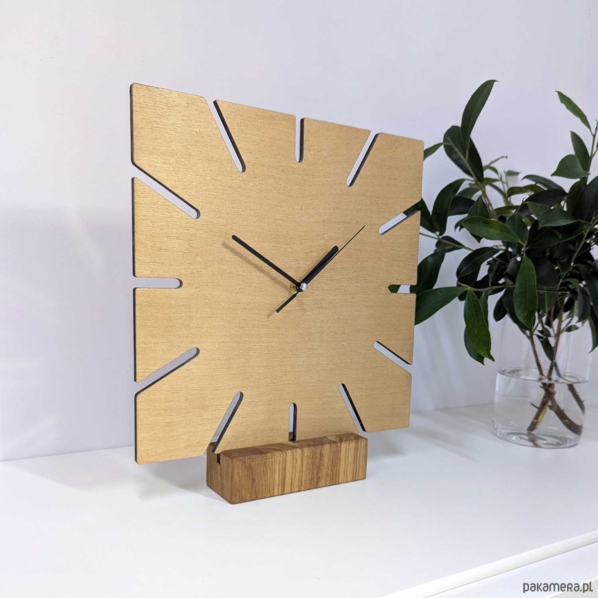Kwadratowy, Minimalistyczny Zegar na podstawce z drewna dębowego.