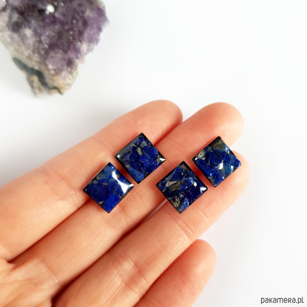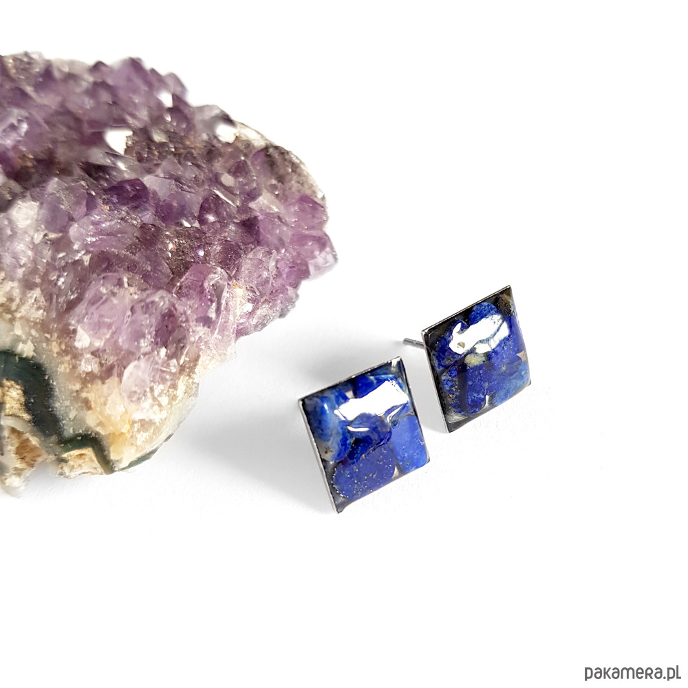 Kolczyki wykonane ręcznie z metalowych baz ze stali chirurgicznej w kształcie kwadratów oraz bryłek lapisu lazuli zatopionych w żywicy jubilerskiej.