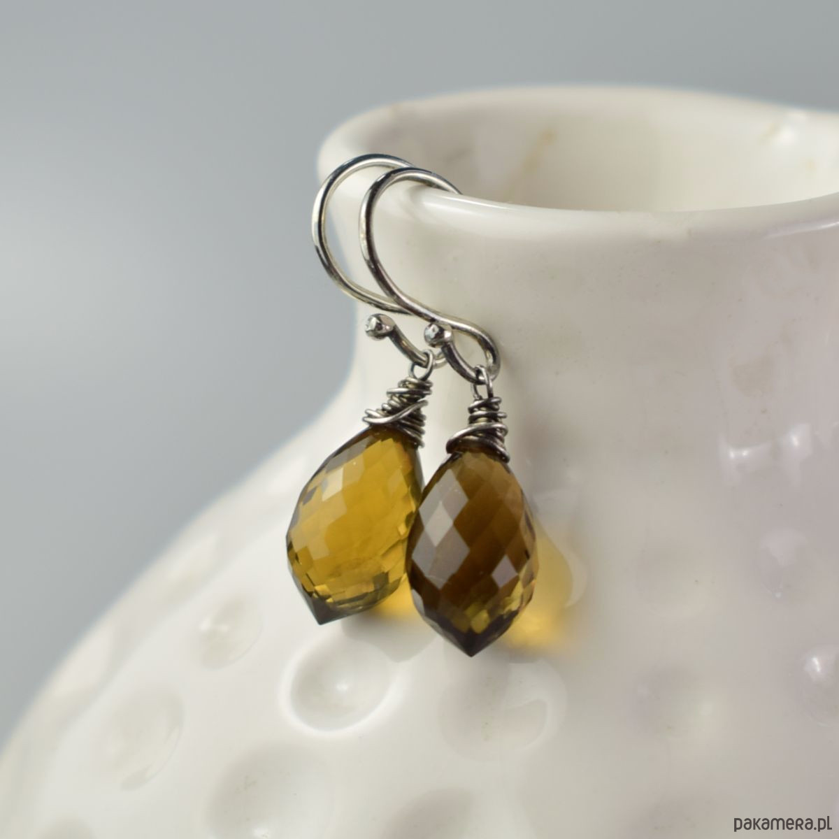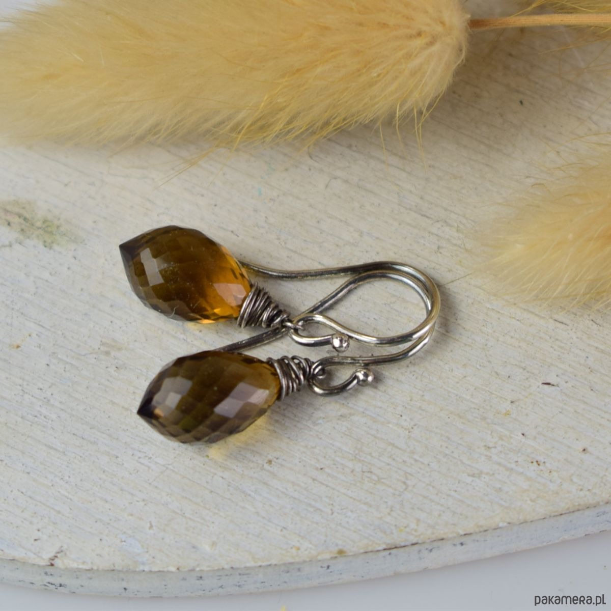Srebrne kolczyki (srebro 925) z kroplami kwarcu dymnego. Biżuteria została zoksydowana i wypolerowana. Długość całego kolczyka 3.4 cm.