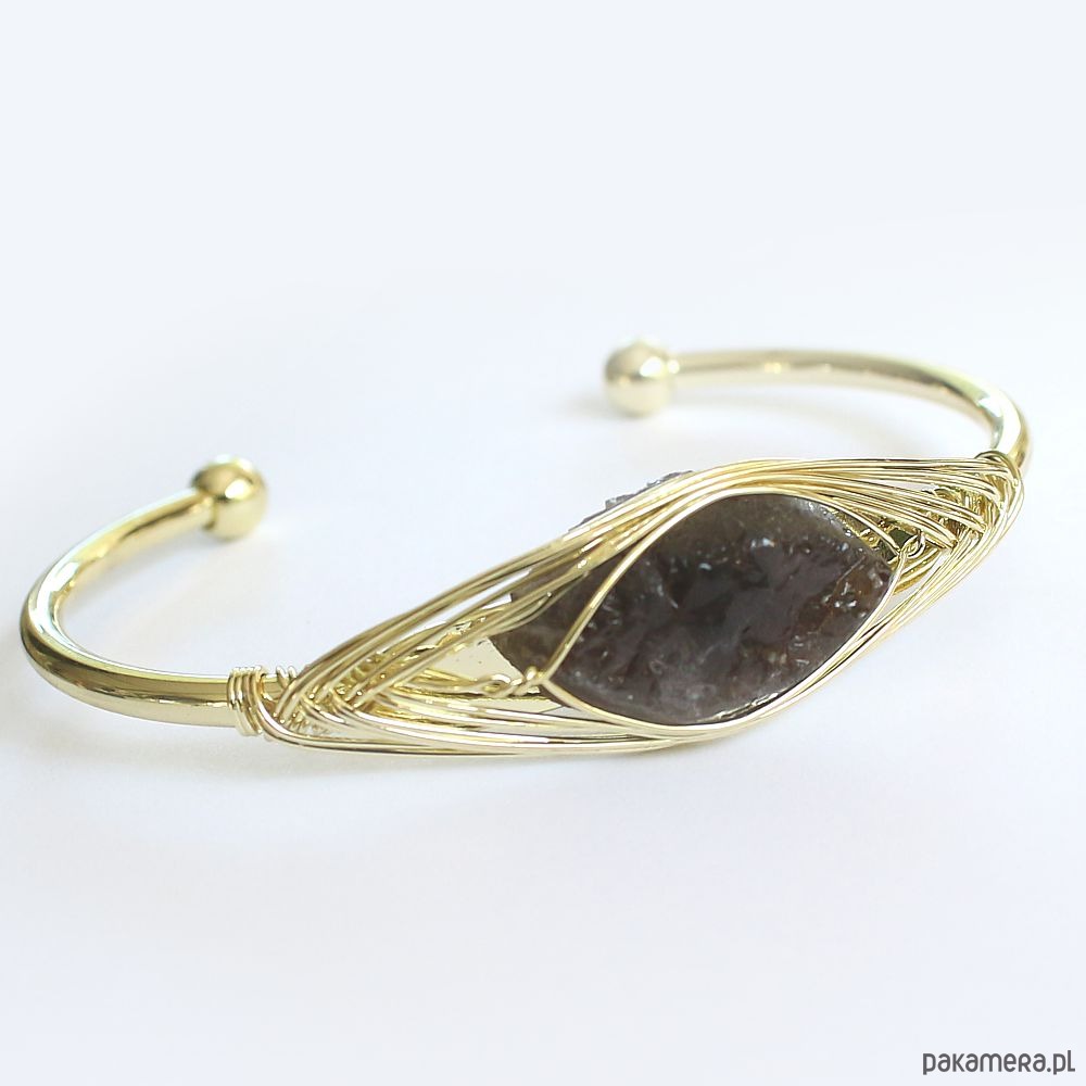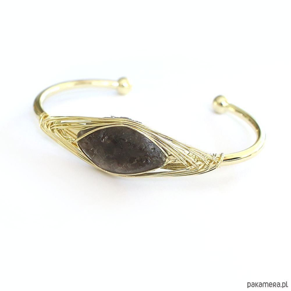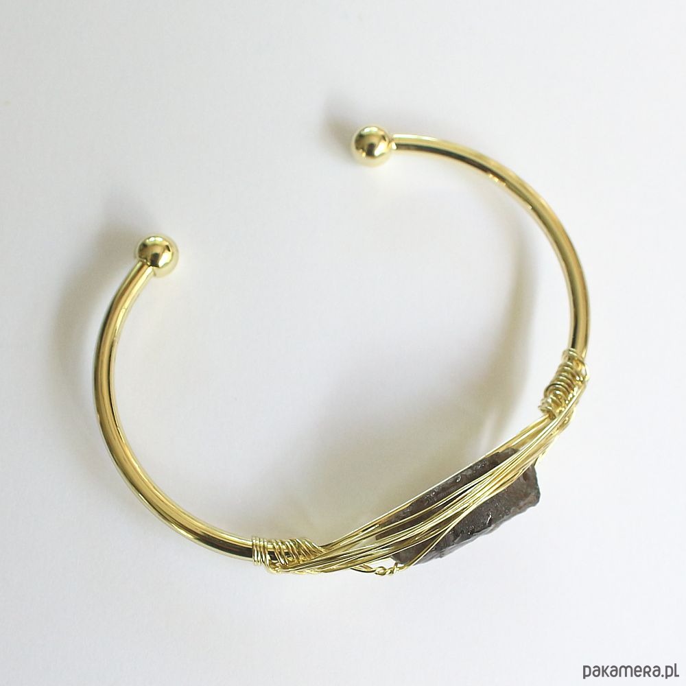 Elegancka energetyczna bransoletka otwarta z pozłacanej miedzi, z pięknym surowym kwarcem dymnym.