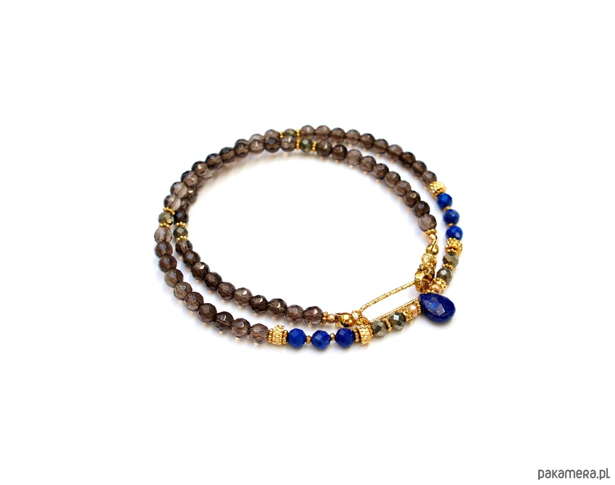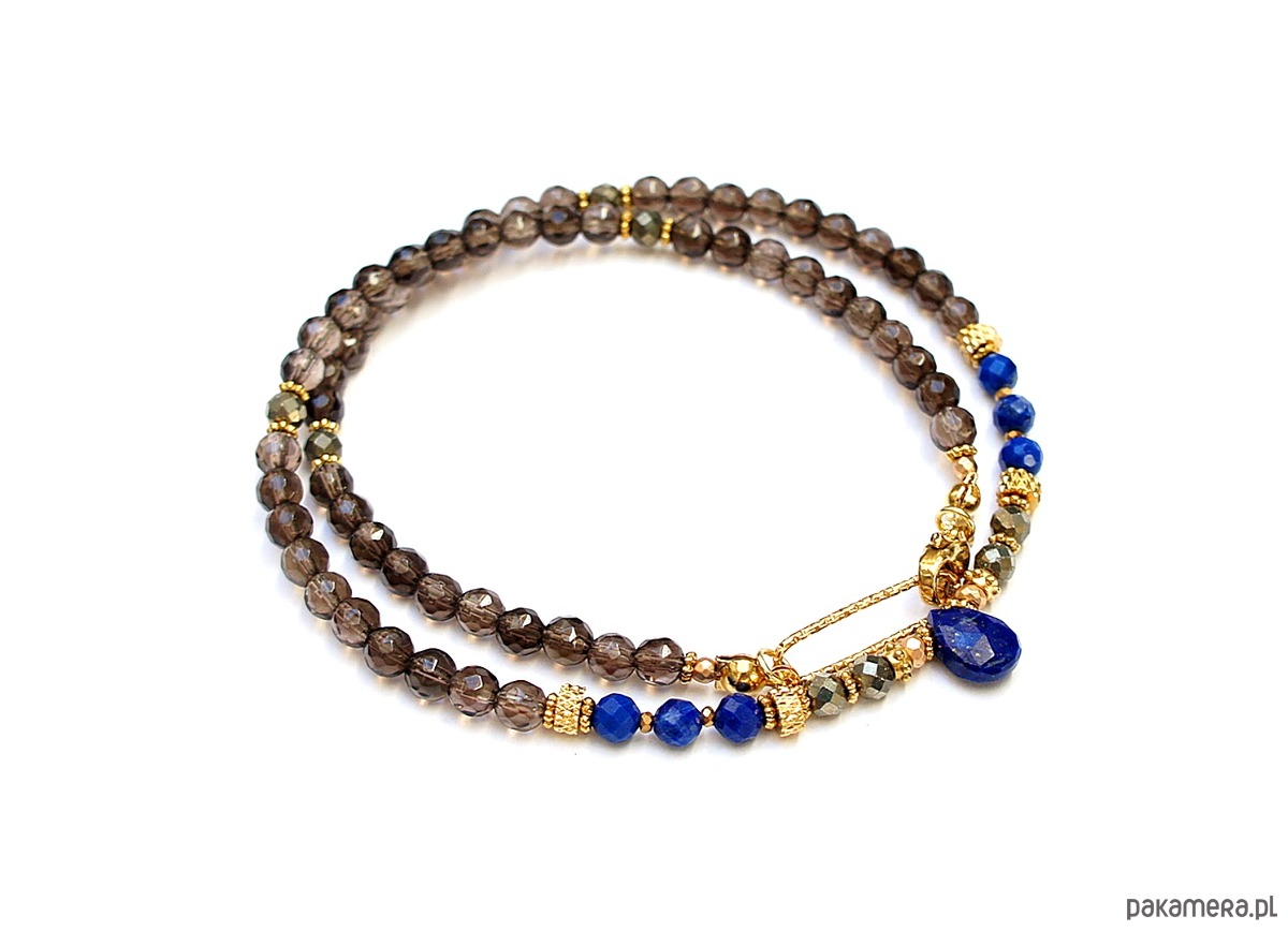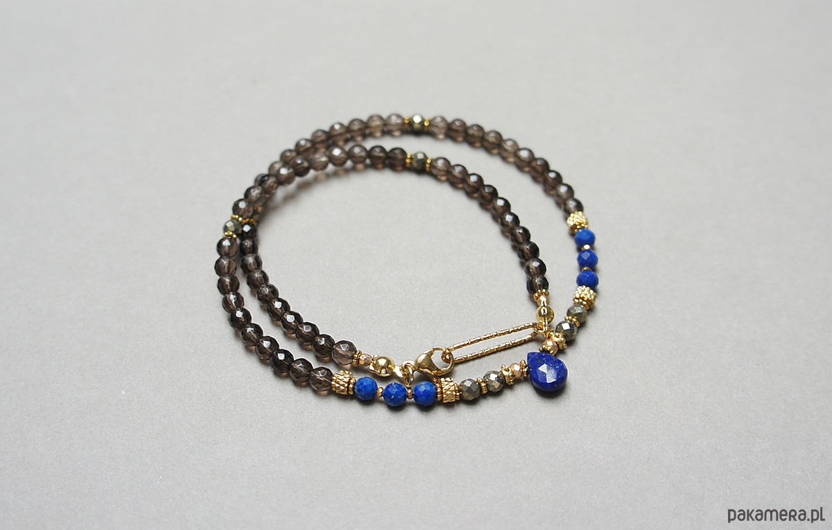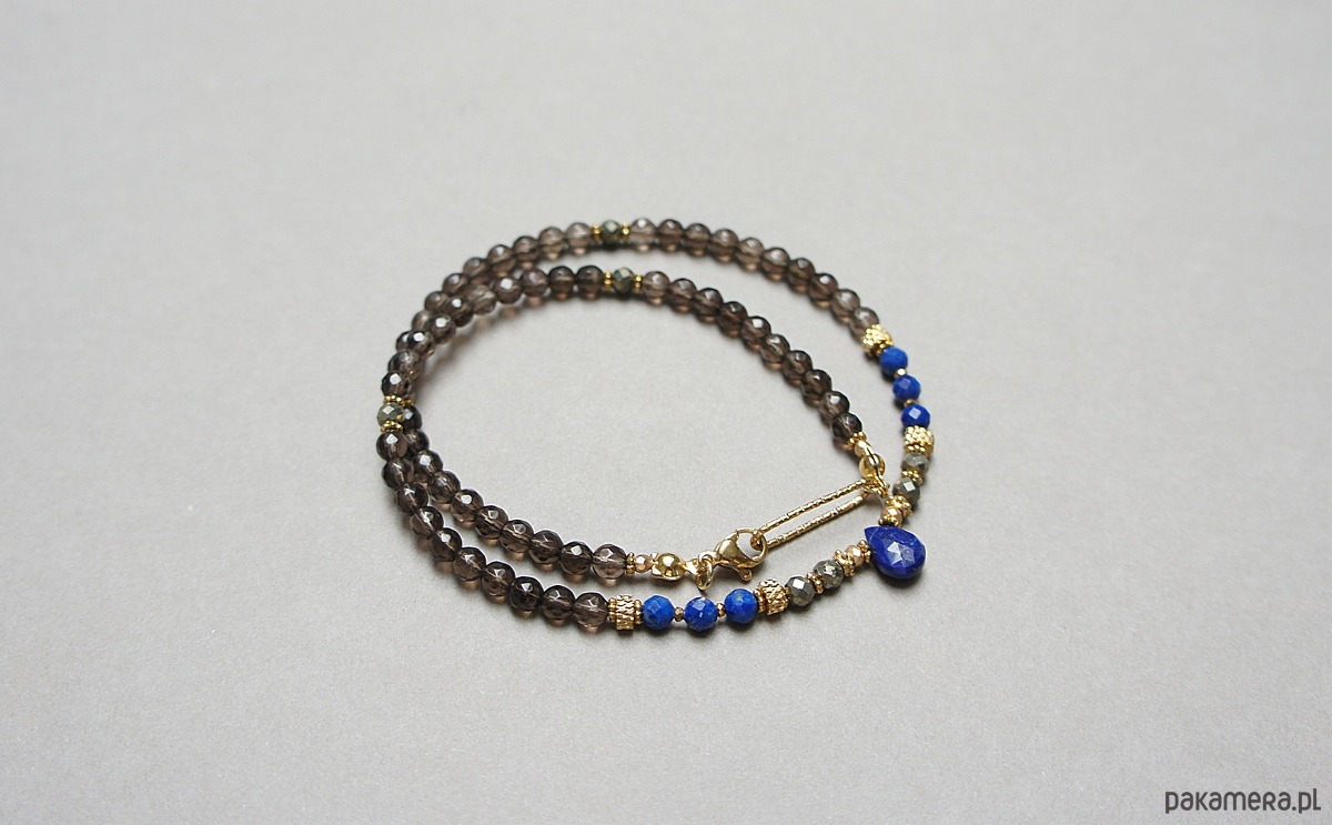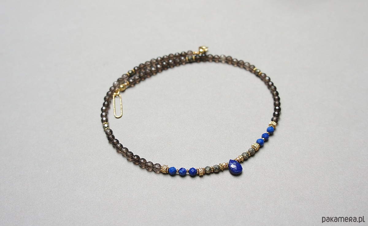 Krótki, delikatny naszyjnik wykonany w całości z pozłacanej stali szlachetnej oraz naturalnych, szlachetnych kamieni - fasetowanych, kuleczek kwarcu dymnego [4mm], pirytu fasetowanego [3,5mm], lapisu lazuli fasetowanego [4mm], hematytu fasetowanego, platerowanego [3x2mm i 2mm], przekładek z hematytu [1mm] oraz zawieszki z fasetowanego lapis lazuli w kształcie kropli. Naszyjnik o długości ok. 41cm.