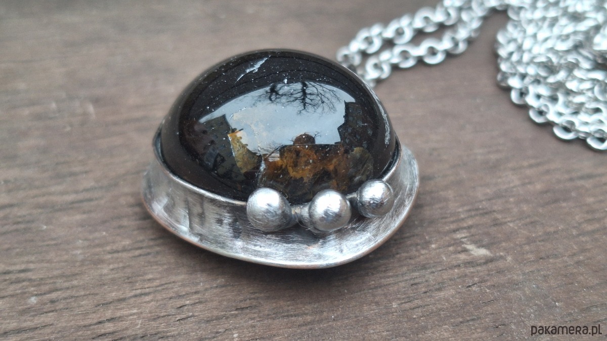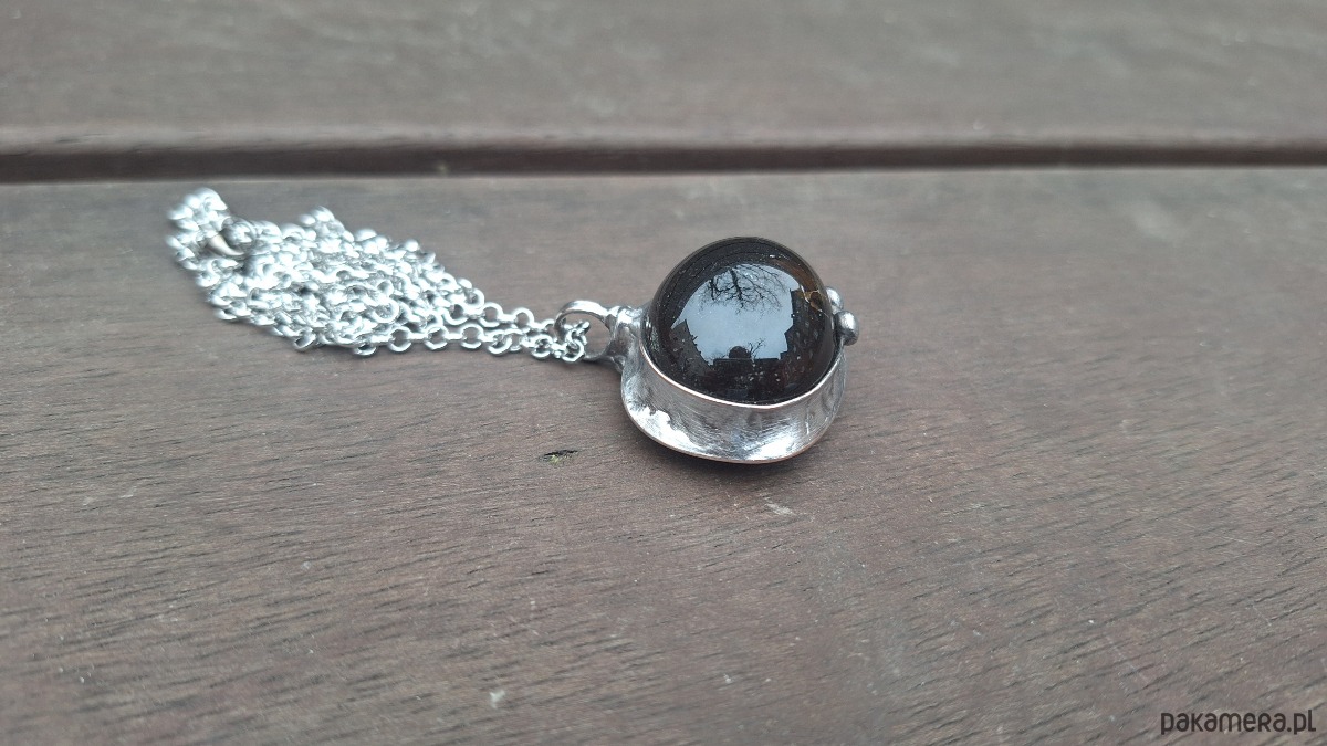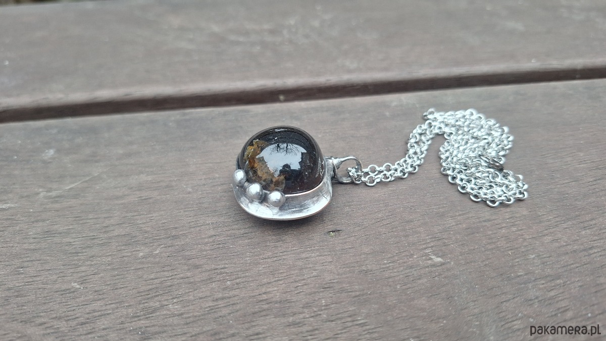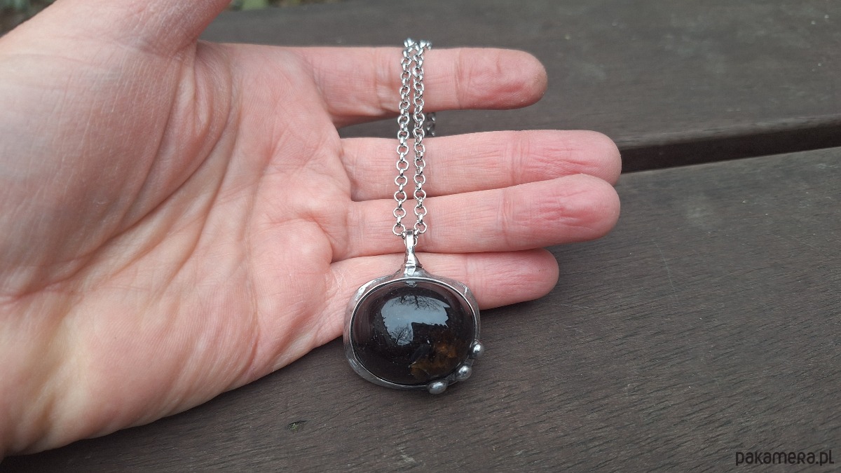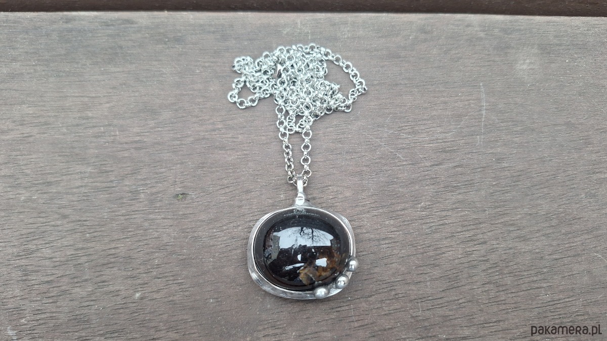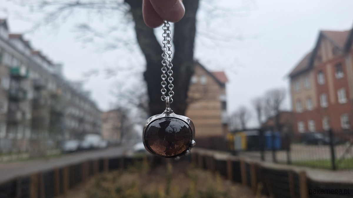 Wisiorek wykonany z miedzi, cyny i kwarcu dymnego. Wymiary ok. 3 na 3 cm. Zawieszony na łańcuszku o długości ok. 50 cm.