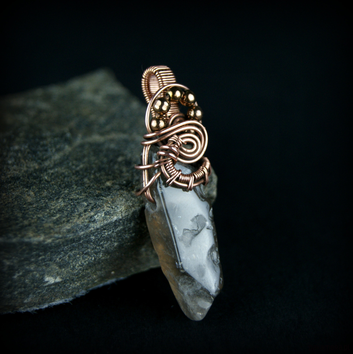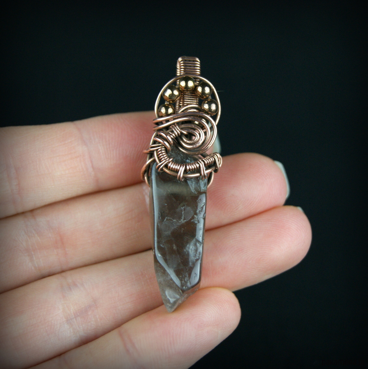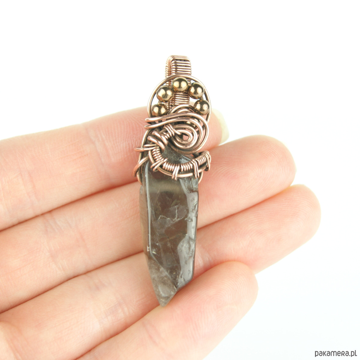 Wisiorek powstał z kwarcu dymnego o nieregularnym kształcie i hematytów, całość misternie opleciona miedzią.