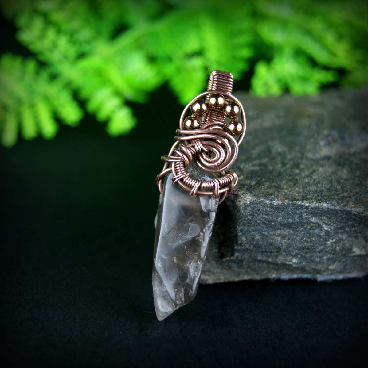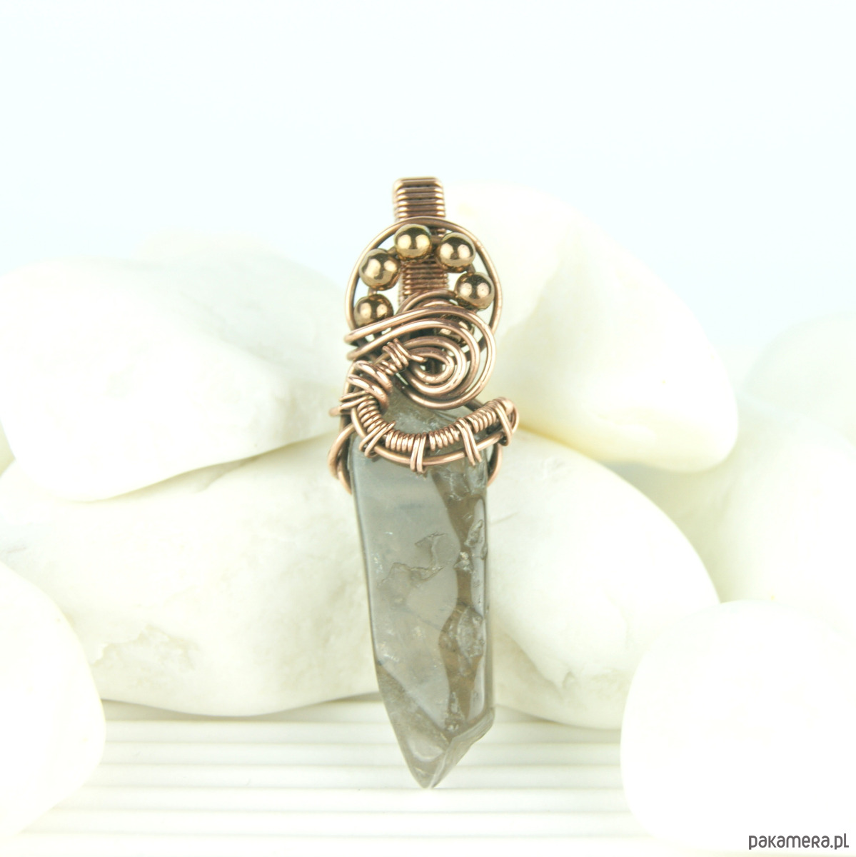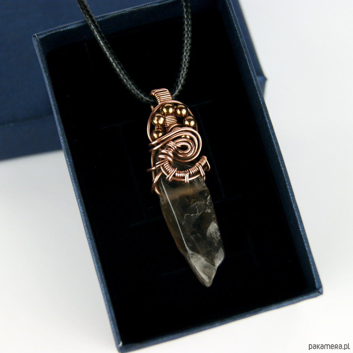 Wisiorek powstał z kwarcu dymnego o nieregularnym kształcie i hematytów, całość misternie opleciona miedzią.
