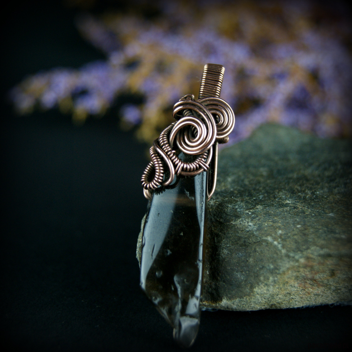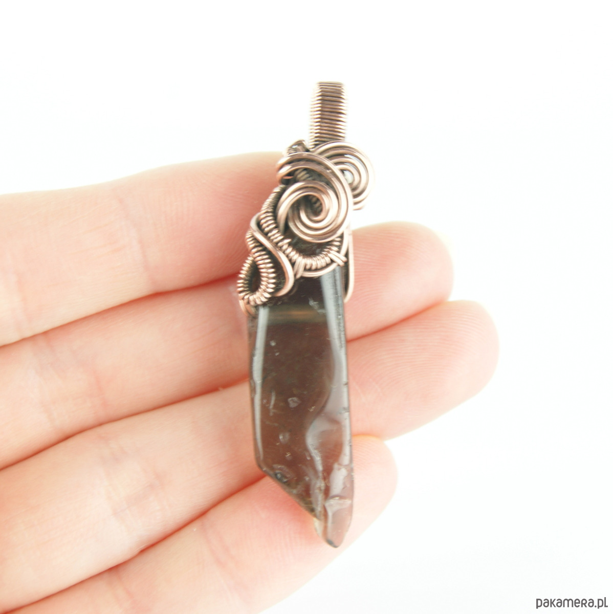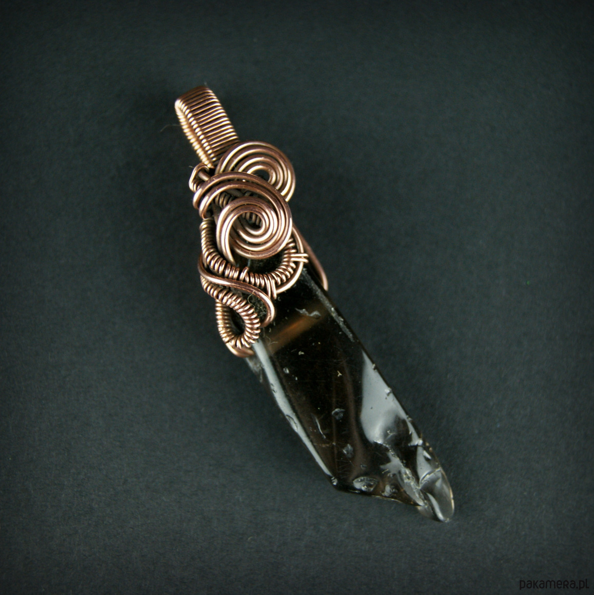 Wisiorek powstał z kwarcu dymnego o nieregularnym kształcie, całość misternie opleciona miedzią.