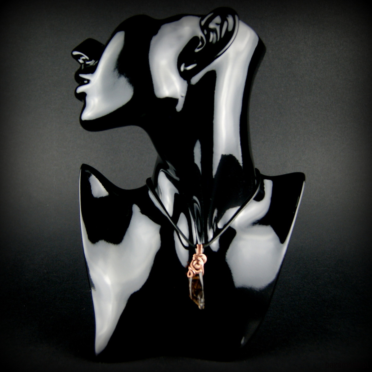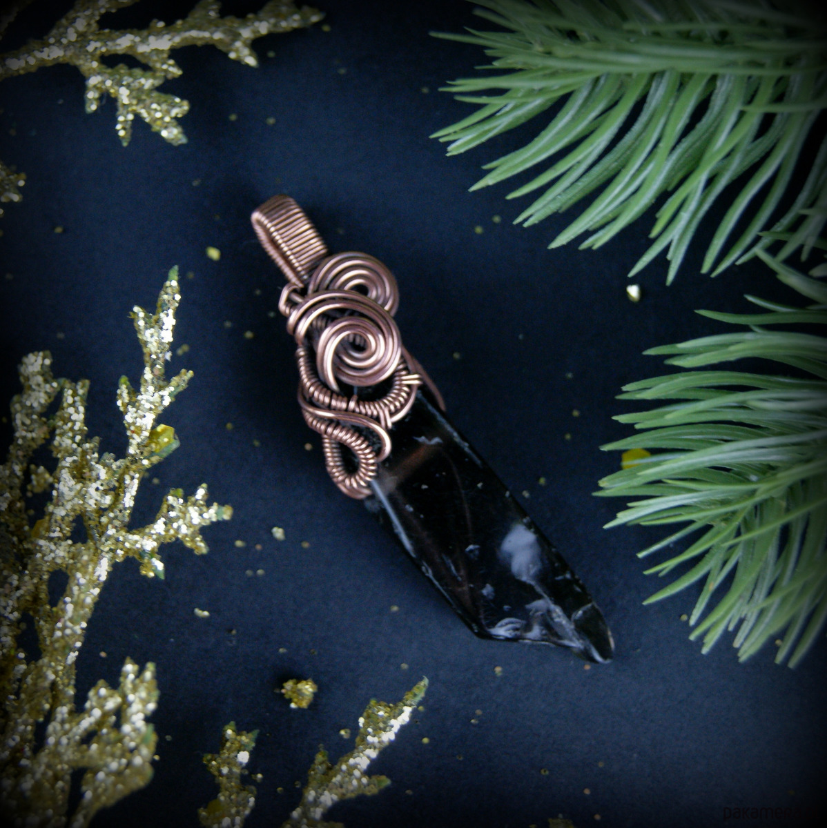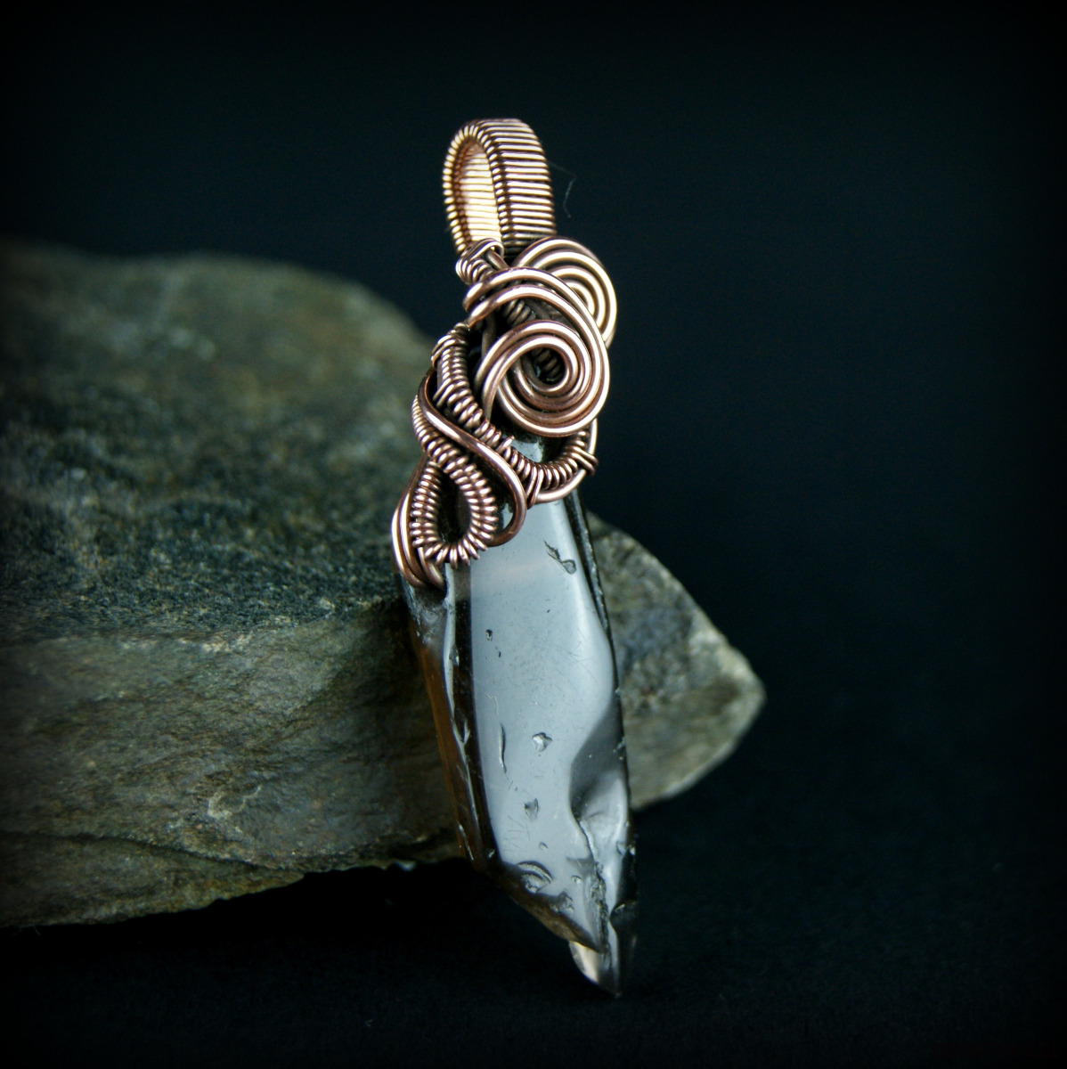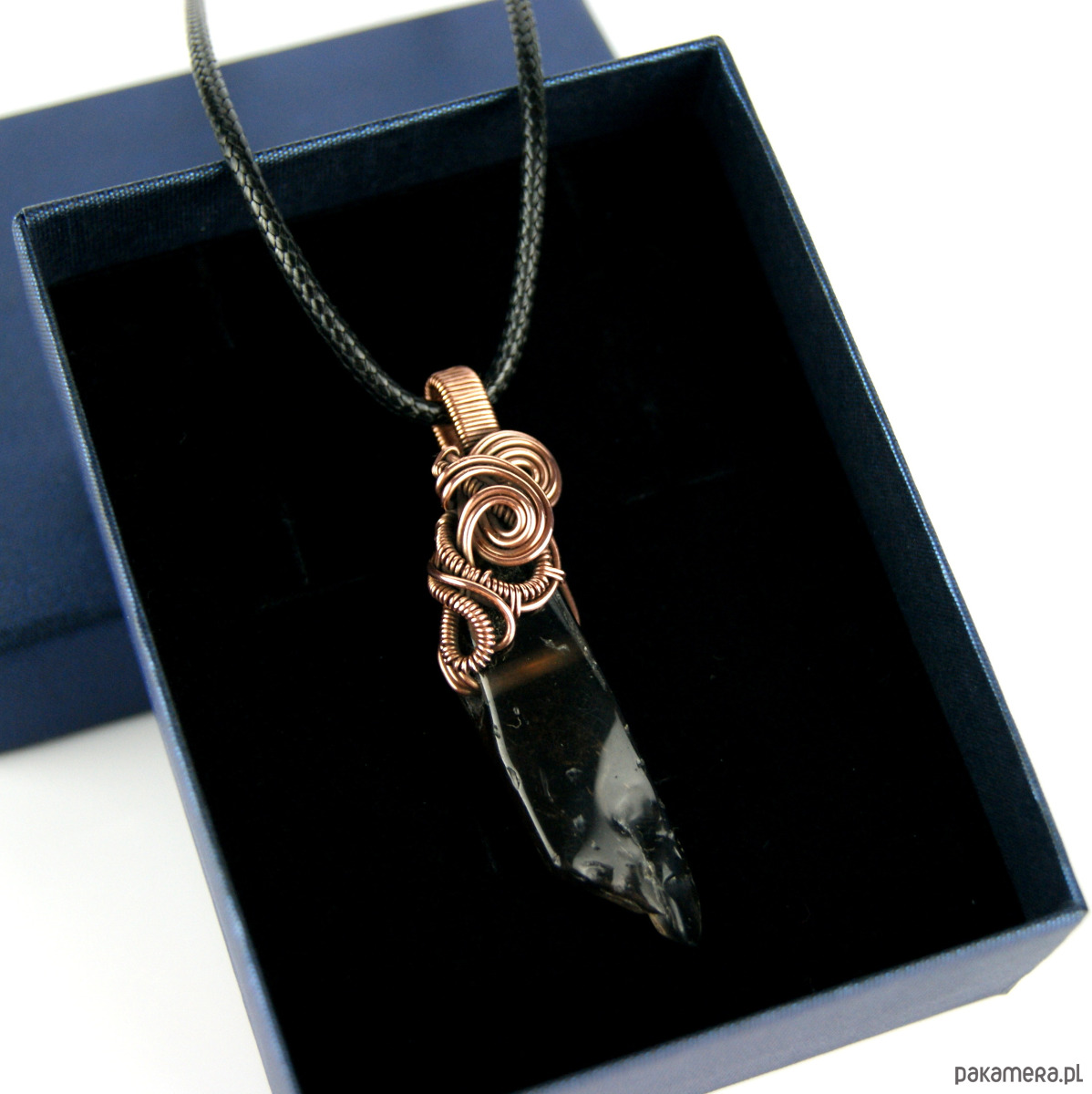 Wisiorek powstał z kwarcu dymnego o nieregularnym kształcie, całość misternie opleciona miedzią.