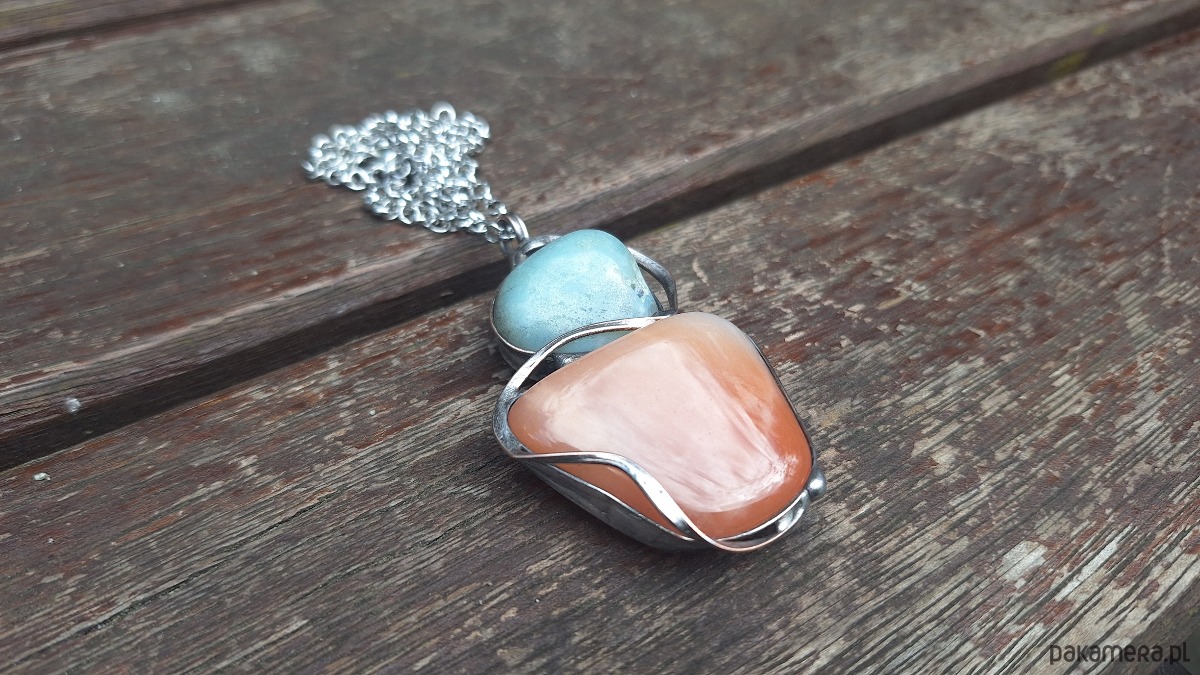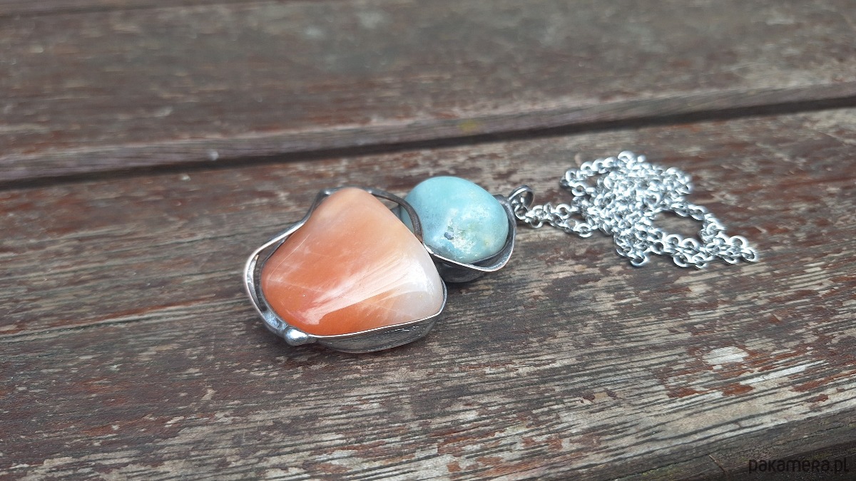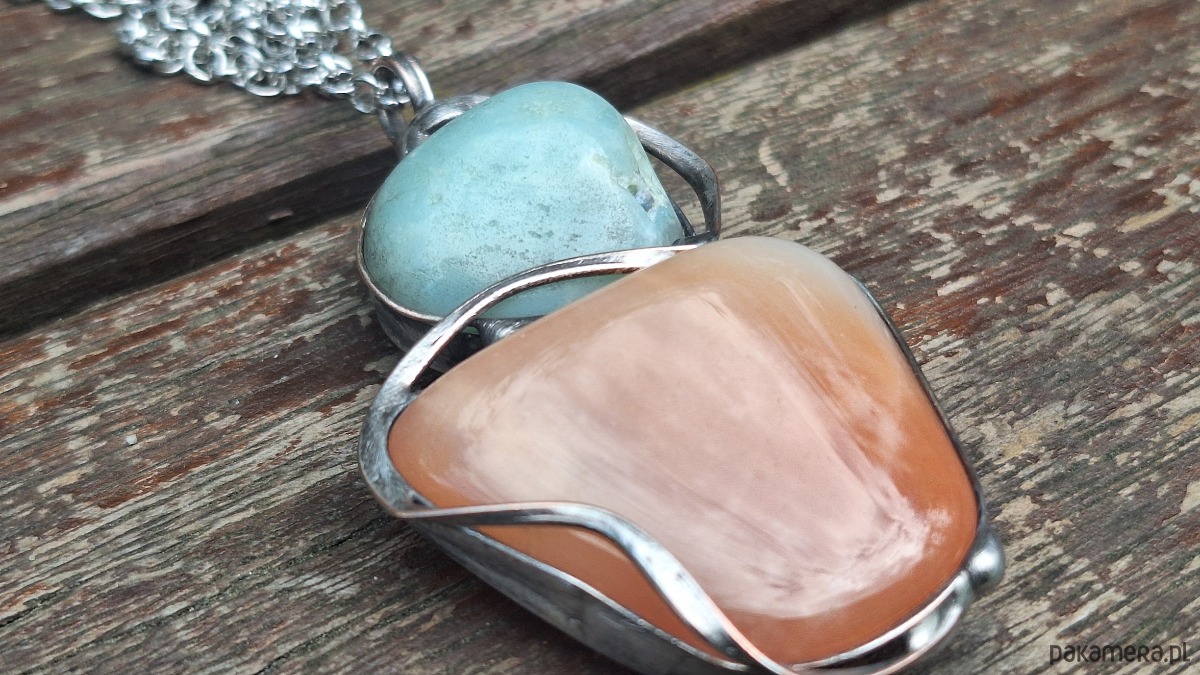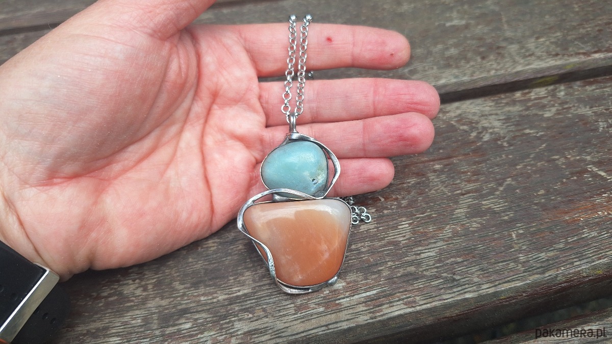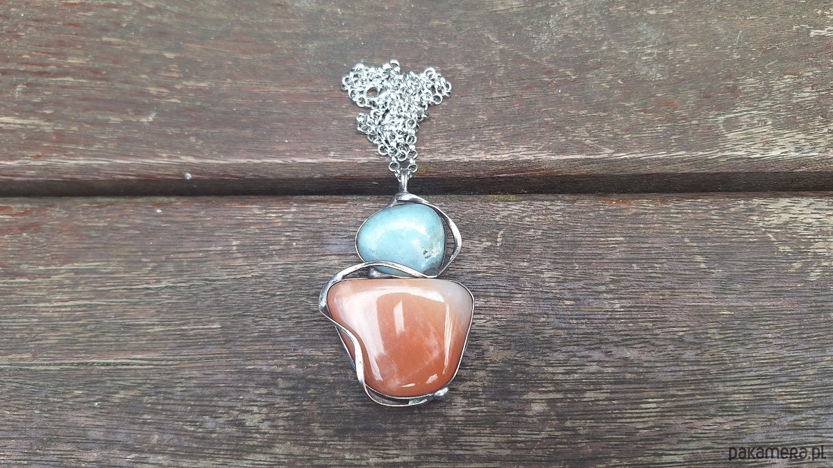 Wisiorek wykonany z miedzi, cyny, amazonitu i kwarcu. Wymiary ok. 5.5 na 4 cm. Zawieszony na łańcuszku o długości ok. 50 cm.