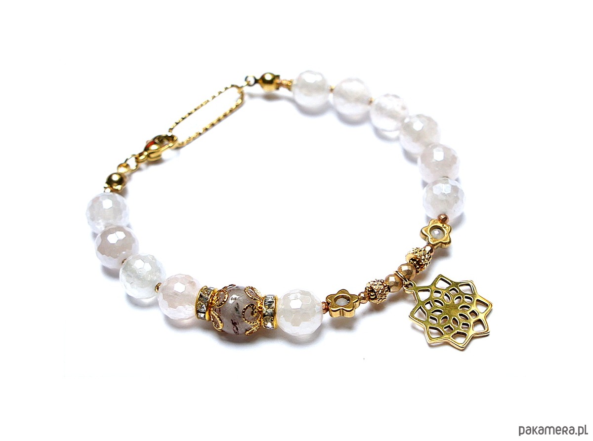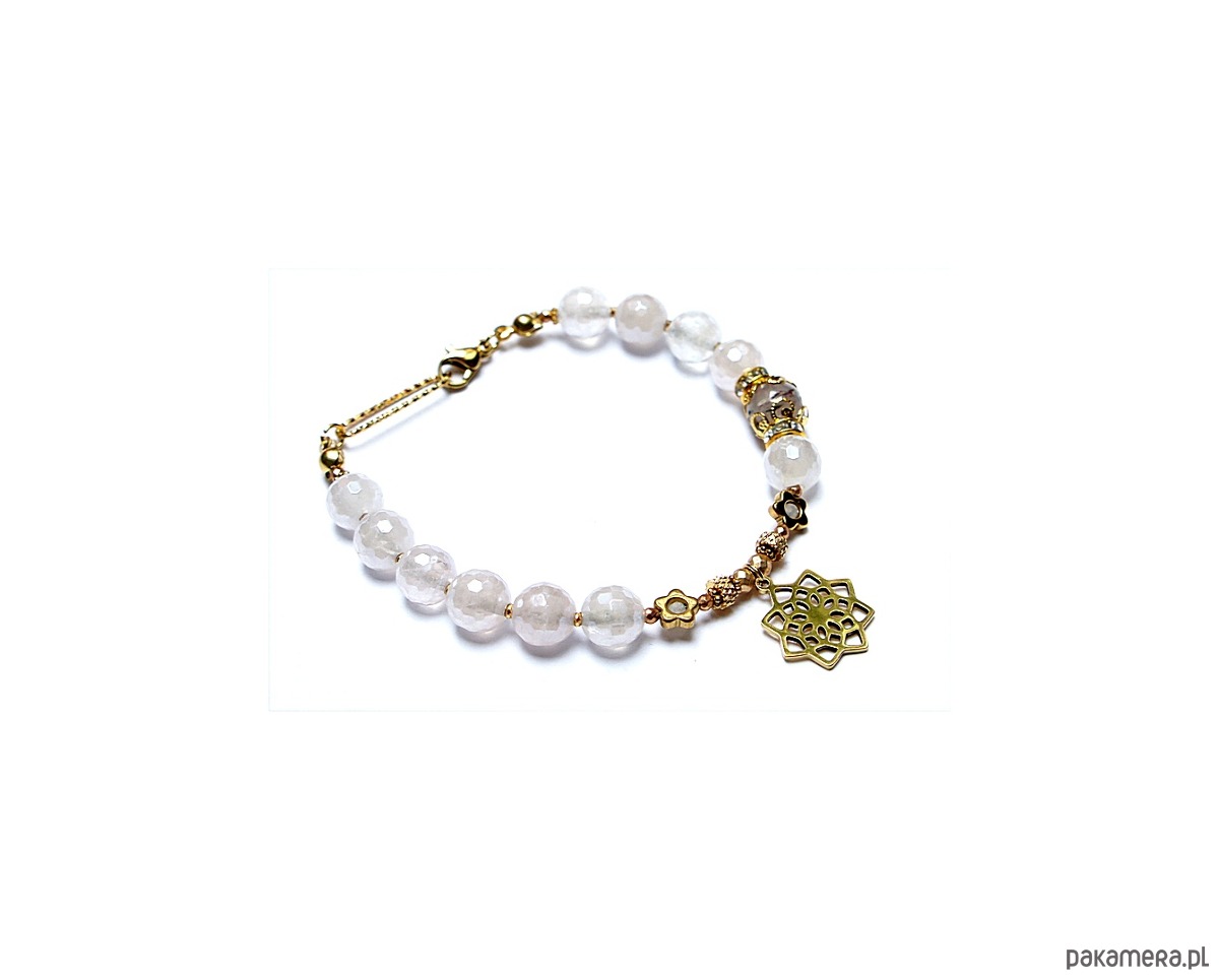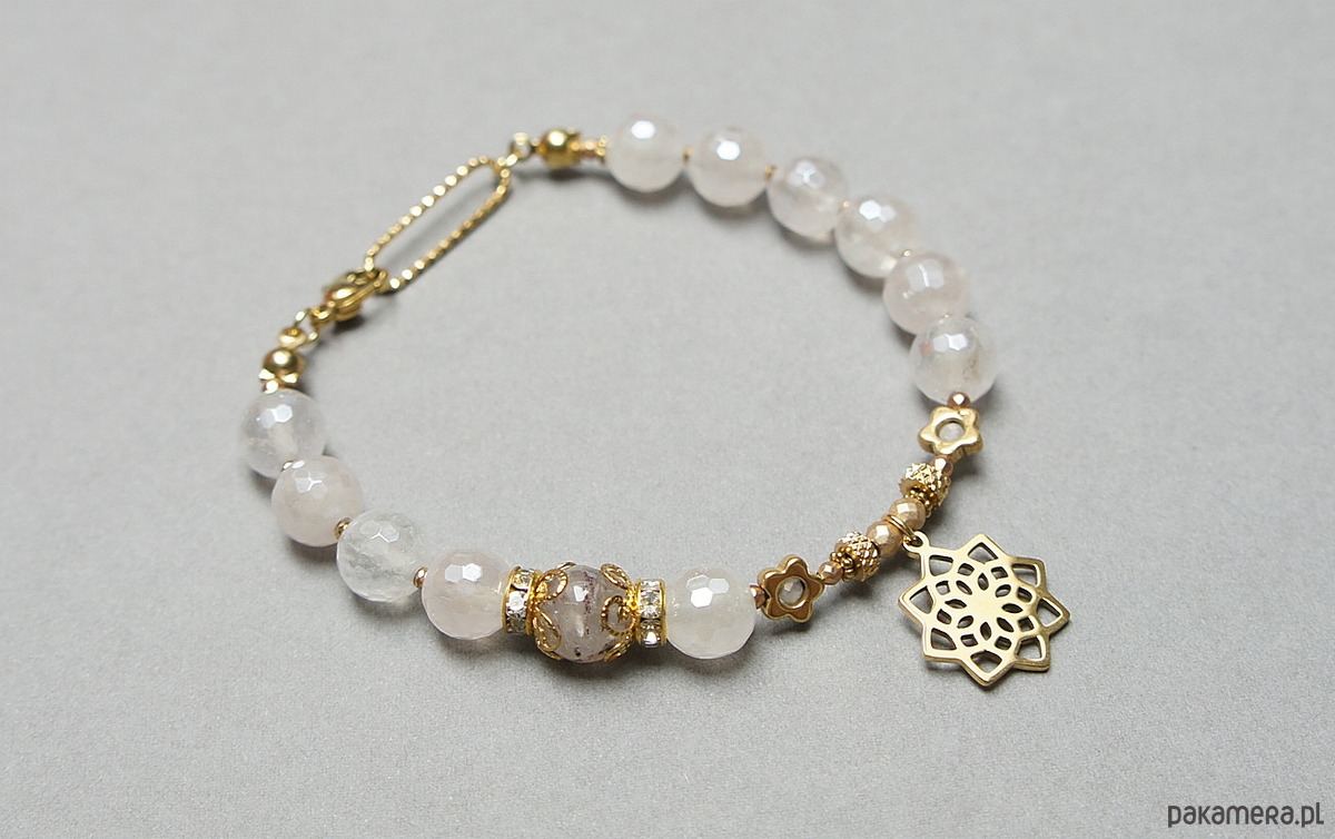 Bransoletka wykonana w całości ze stali szlachetnej pozłacanej, naturalnych kamieni - kwarc różowy fasetowany, platerowany [8mm], labradorytc [8mm], fasetowanych hematytów [3mm i 2mm], przekładek z hematytu [1mm i 6mm - kwiatki]. Całkowita długość bransoletki ok. 19,5cm. Biżuteria ozdobnie zapakowana.