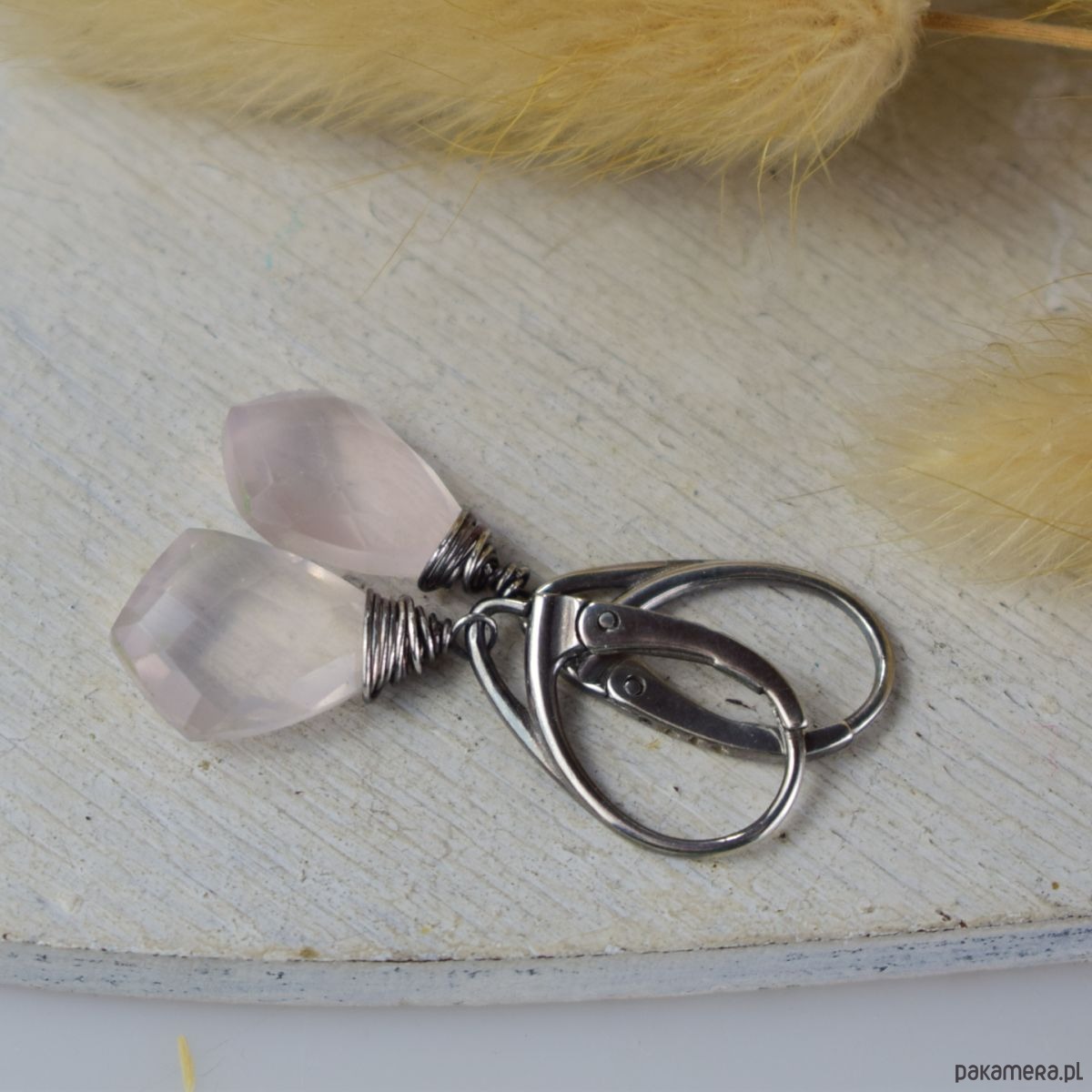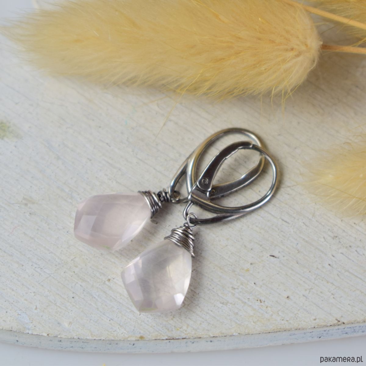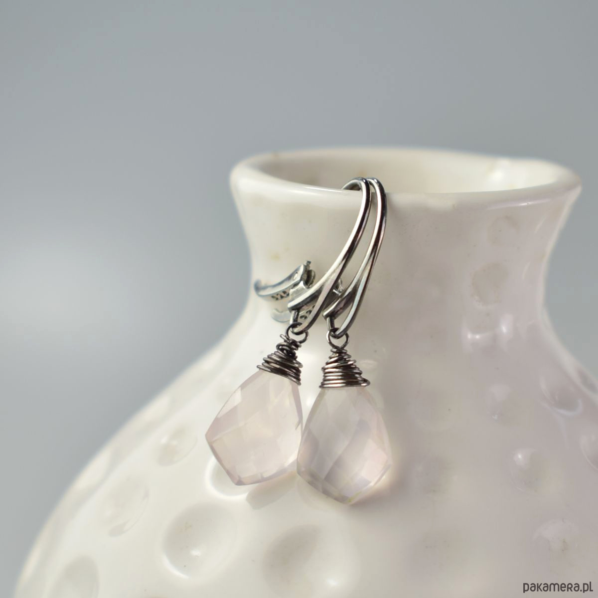 Srebrne kolczyki (srebro 925) z kroplami kwarcu różowego. Biżuteria została zoksydowana i wypolerowana. Długość całego kolczyka 3.4 cm.