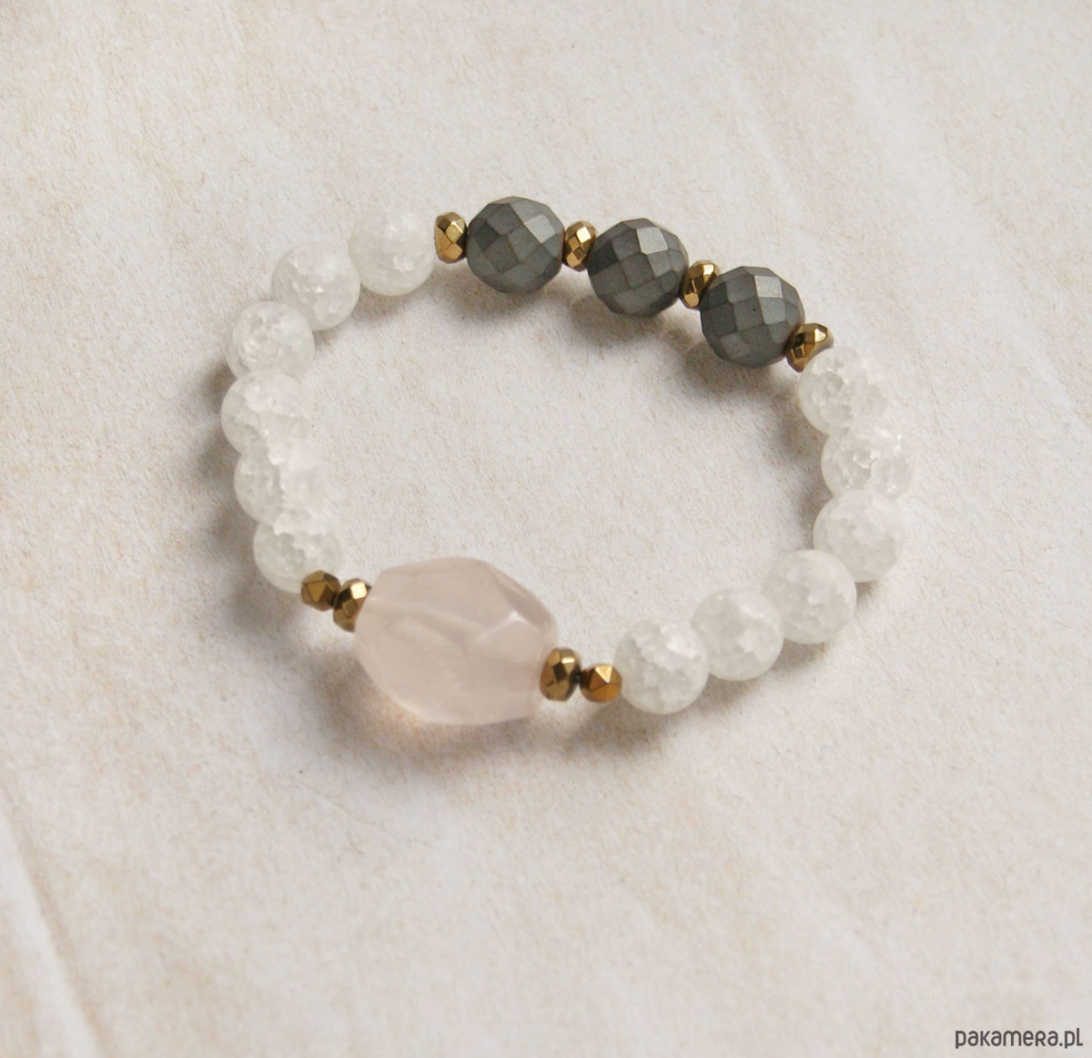 OKAZAŁA, niezwykle efektowna bransoletka na solidnej lince elastycznej, wykonana z matowego kwarcu lodowego (10mm), ogromnej bryłki kwarcu różowego (ok.20mm). matowego, fasetowanego hematytu (12mm), oponek fasetowanego hematytu.