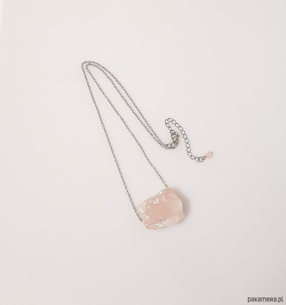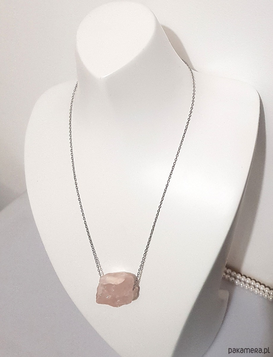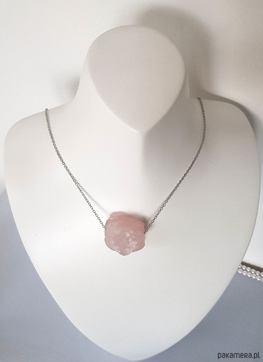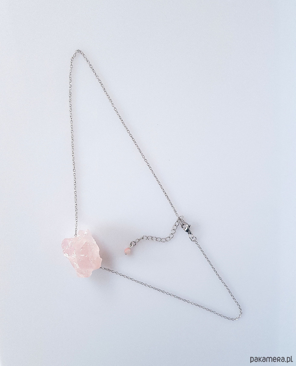 Bryła naturalnego, surowego kwarcu różowego osadzona ruchomo na łańcuszku ze stali szlachetnej.