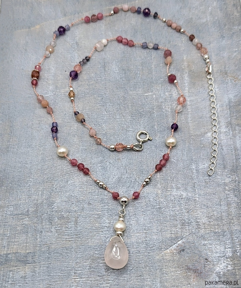 Naszyjnik na jedwabnej nici wykonany z pięknie szlifowanych i delikatnych kamieni. Zawieszka z różowego kwarcu jest ozdobiona perełką. Na jedwabnej nici znajdują się ponadto: różowe turmaliny, kamienie słoneczne, ametysty, tanzanity, opale peruwiańskie i perły. Naszyjnik jest asymetryczny, kamienie są ułożone intuicyjnie. Główne intencje to radość, kreatywność i swoboda. Wybór kamieni które są atrybutami znaków ziemii i powietrza.