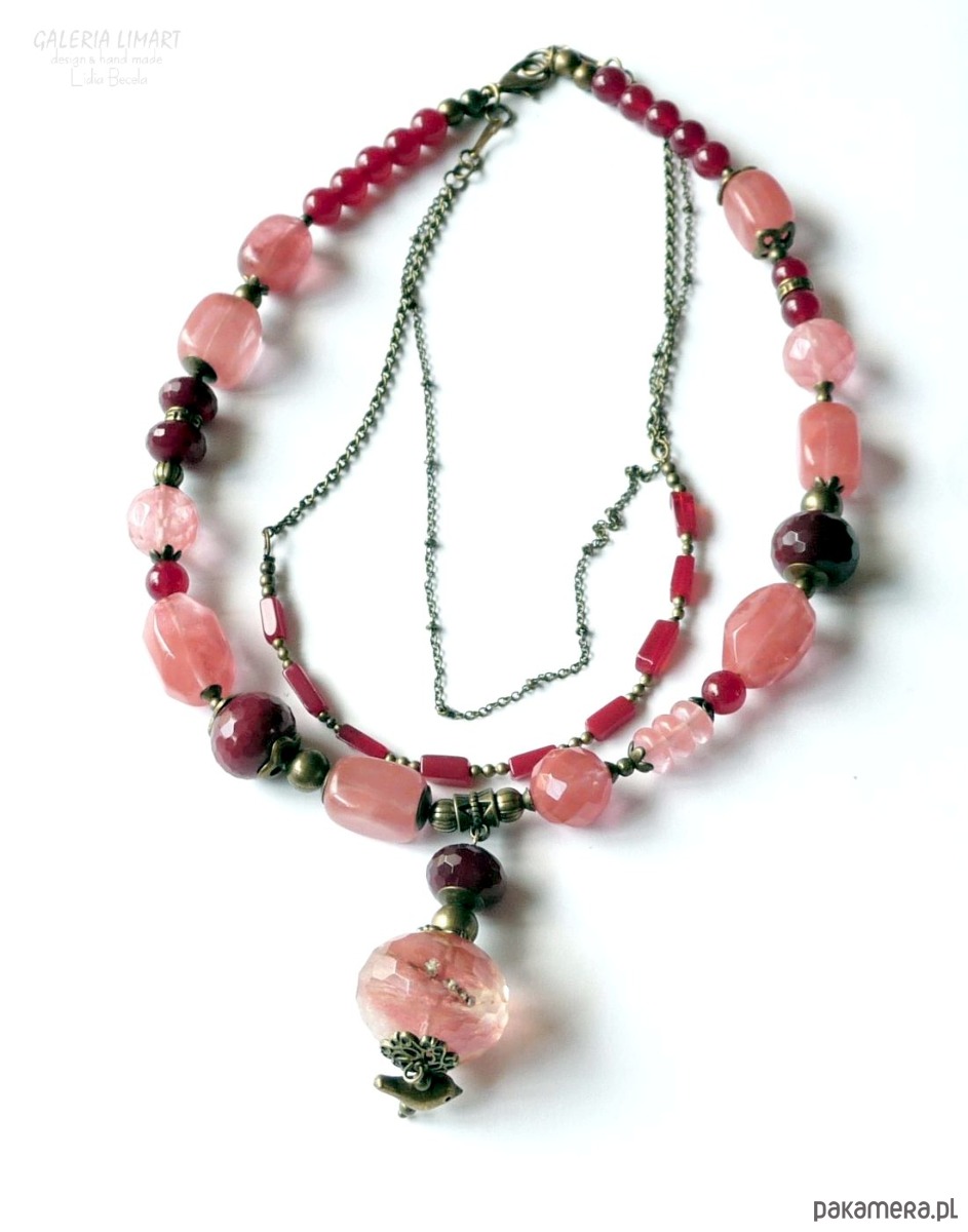 Kwarc różowy, wiśniowy i turmalin. Naszyjnik unikatowy handmade PREZENT lux