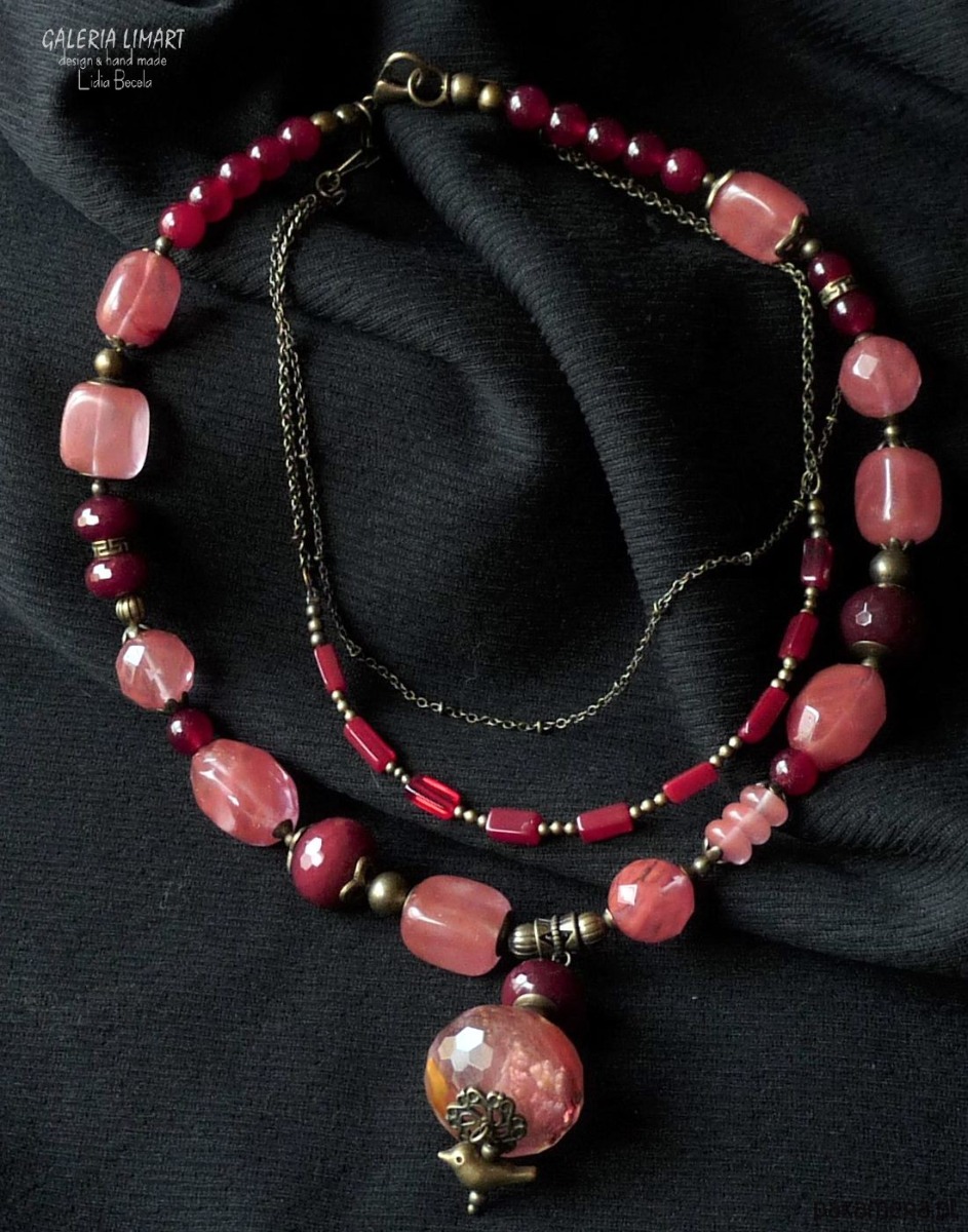 Moja unikatowa, niezmiernie efektowna i elegancka kompozycja naszyjnika z minerałów: kwarcu różowego, kwarcu wiśniowego i drobnych turmalinów (zwieszone na łańcuszku) tworząca perfekcyjną konfigurację kolorystyczną z dobrymi właściwościami. Centralnie dorodny fasetowany kwarc różowy zwieńczony uroczym mosiężnym ptaszkiem.