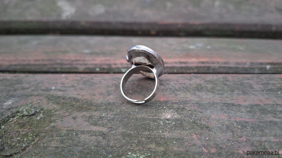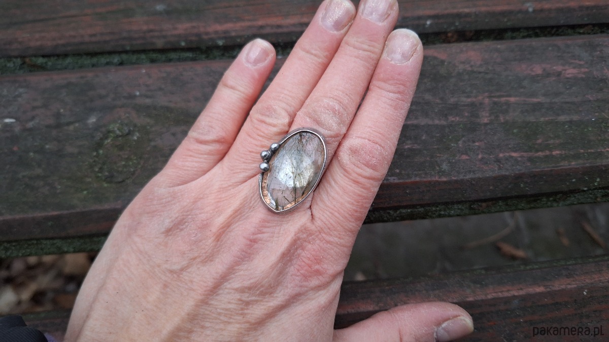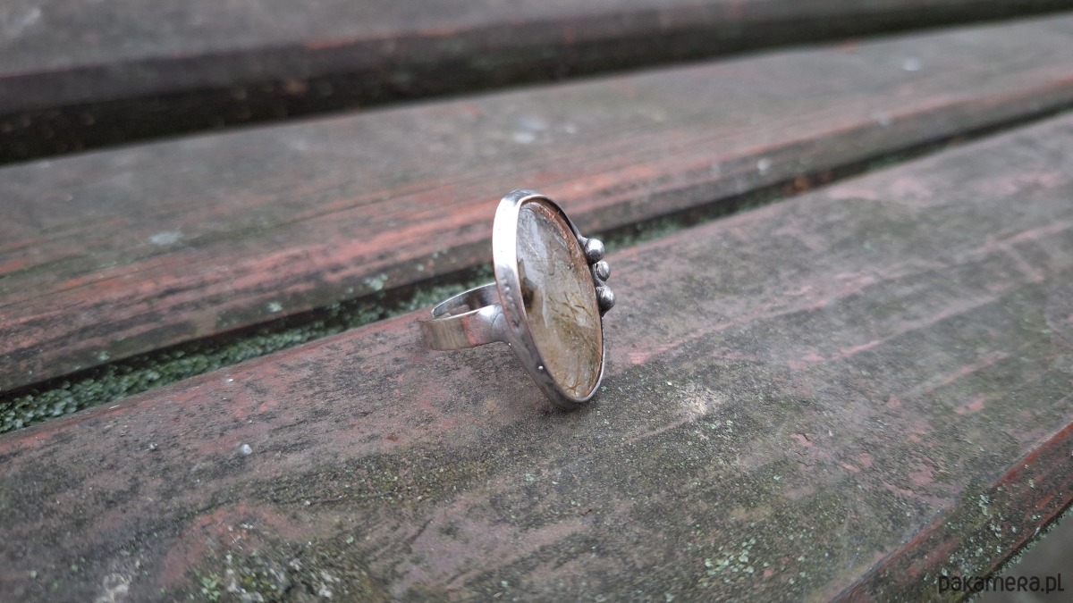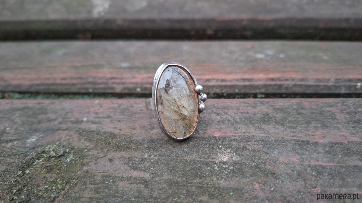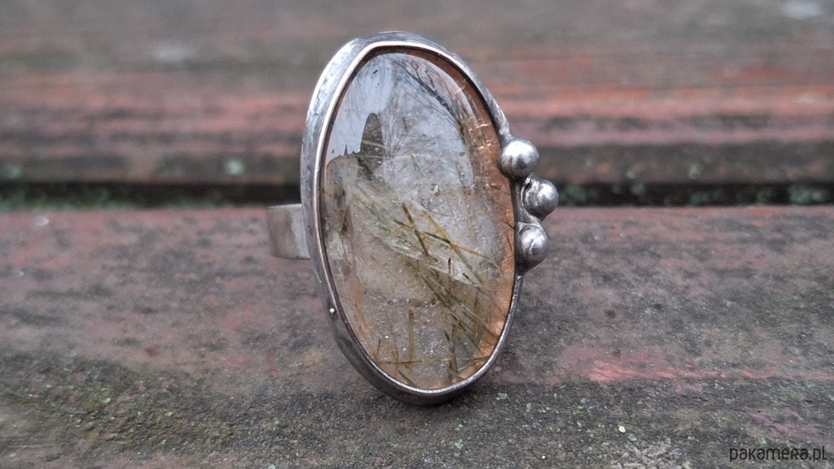 Pierścionek wykonany z miedzi, cyny i kwarcu z rutylem. Wymiary ok. 3 na 1.7 cm. Regulowany. Nie jest ciężki.