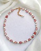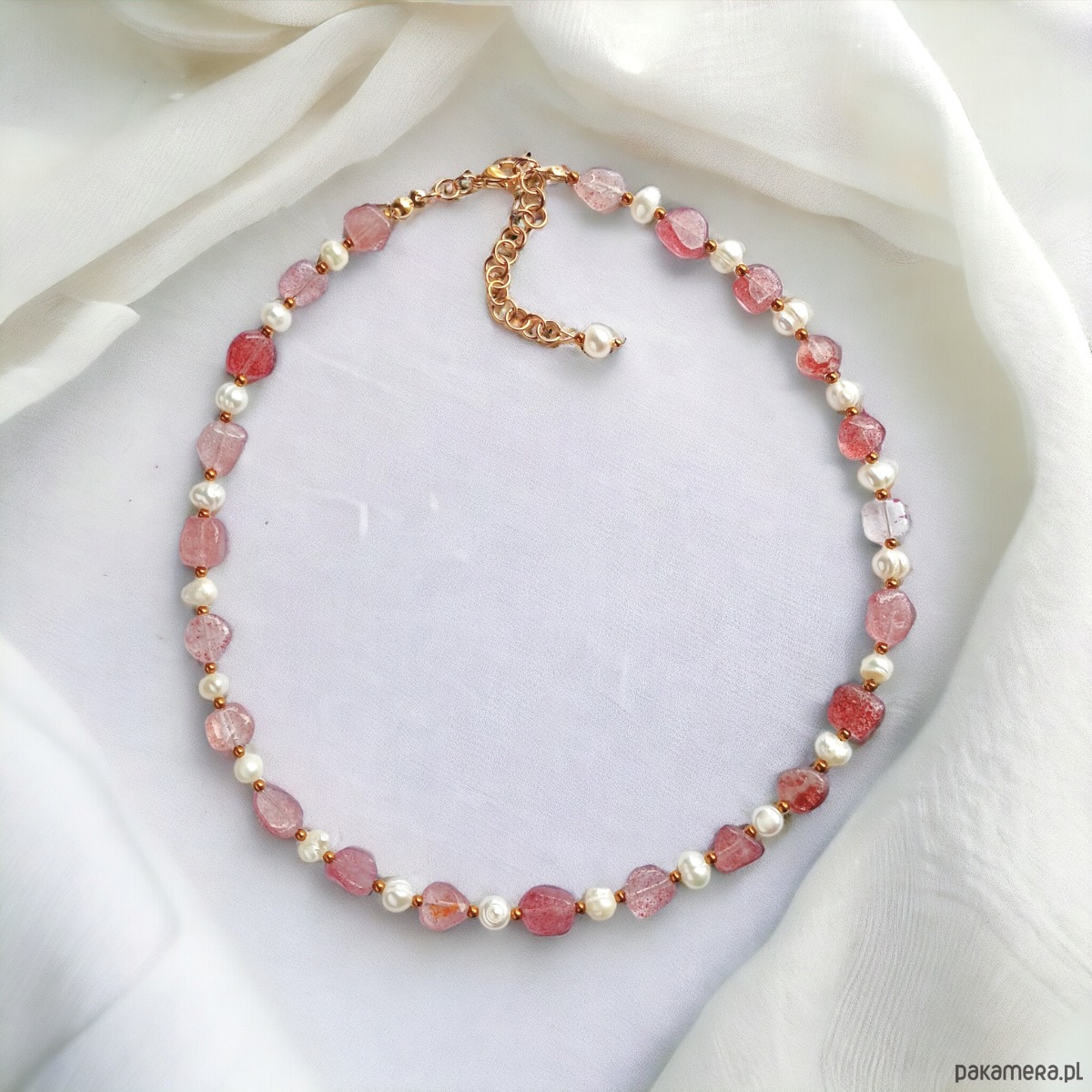 wykonany z nieregularnych, polerowanych bryłek kwarcu truskawkowego oraz naturalnych pereł słodkowodnych i złotego hematytu.