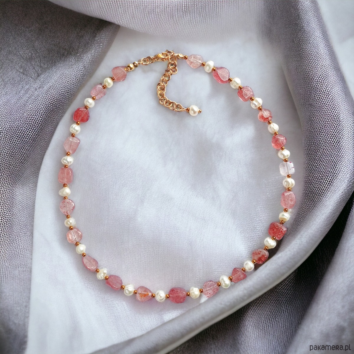 wykonany z nieregularnych, polerowanych bryłek kwarcu truskawkowego oraz naturalnych pereł słodkowodnych i złotego hematytu.