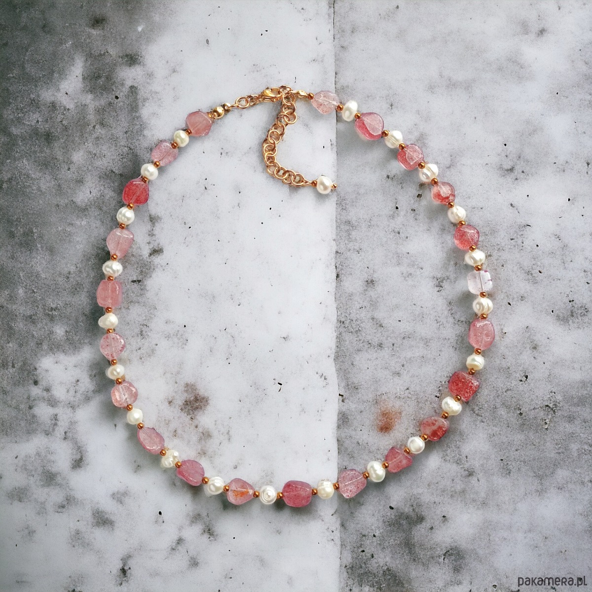 wykonany z nieregularnych, polerowanych bryłek kwarcu truskawkowego oraz naturalnych pereł słodkowodnych i złotego hematytu.