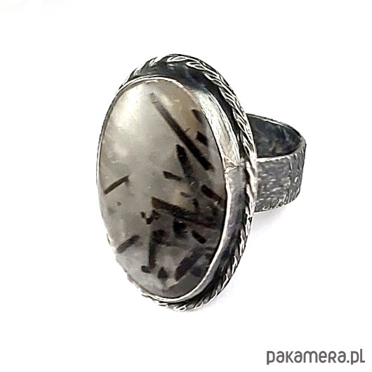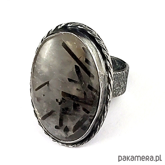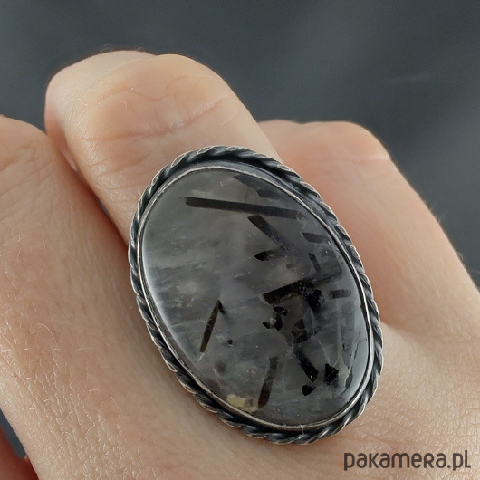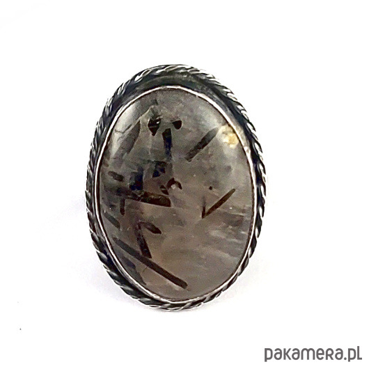 Okazały pierścień z ciekawym kwarcem z inkluzjami turmalinu. Wymiary oprawy kamienia 29 x 20 mm, rozmiar jubilerski 14, mogę powięszyć obrączkę na rozmiar max 15. Waga 10 g, Pierścionek zostanie zapakowany w ozdobne pudełeczko.
