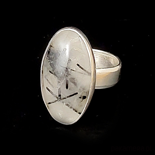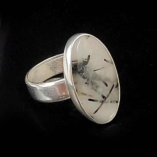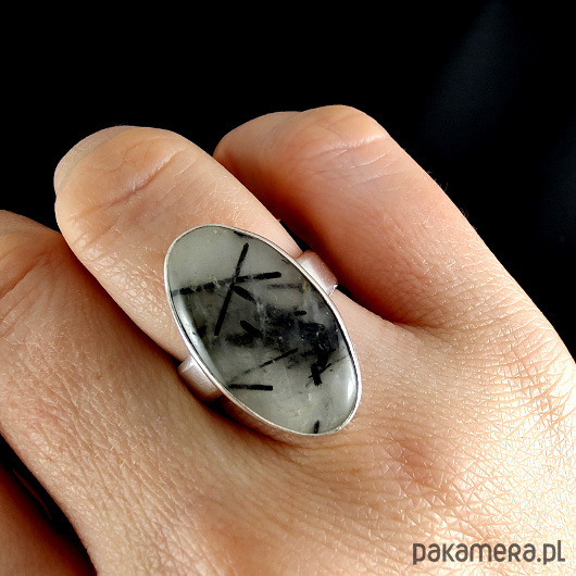 Pierścionek wykonany ze srebra próby 925 oraz naturalnego kwarcu z inkluzjami czarnego turmalinu. Oprawa 23 x 13 mm. Waga 6.8g. Dziewczęcy, subtelny, klasyczny. Rozmiar jubilerski regulowany w szerokim zakresie. Pierścionek zostanie zapakowany w ozdobne pudełeczko.