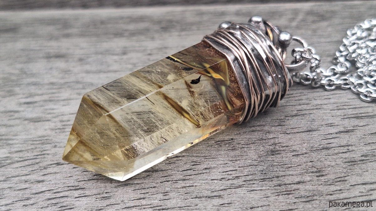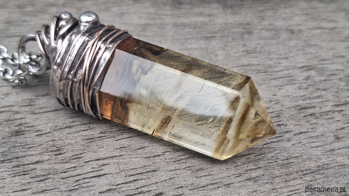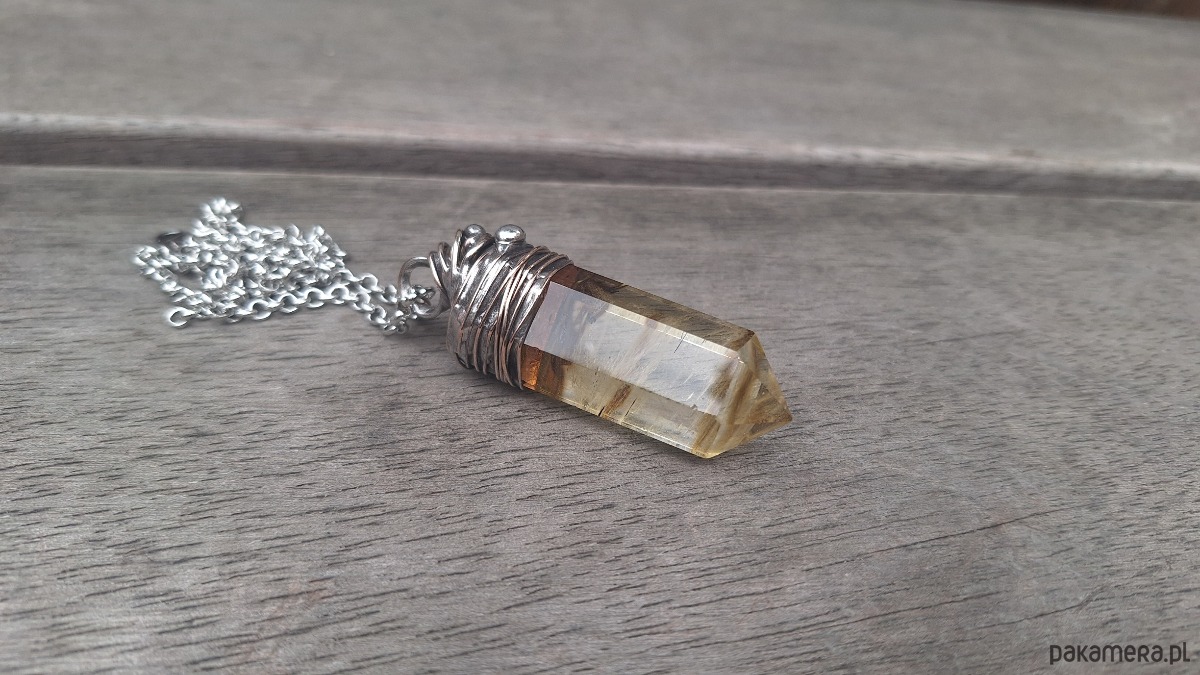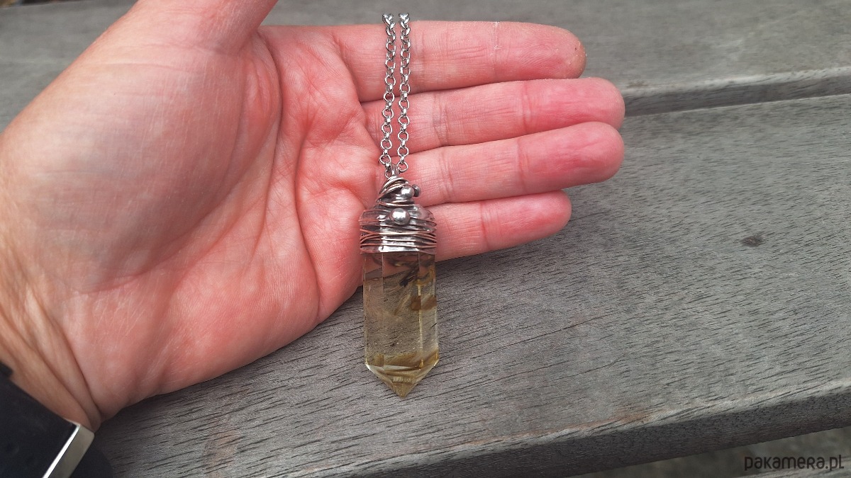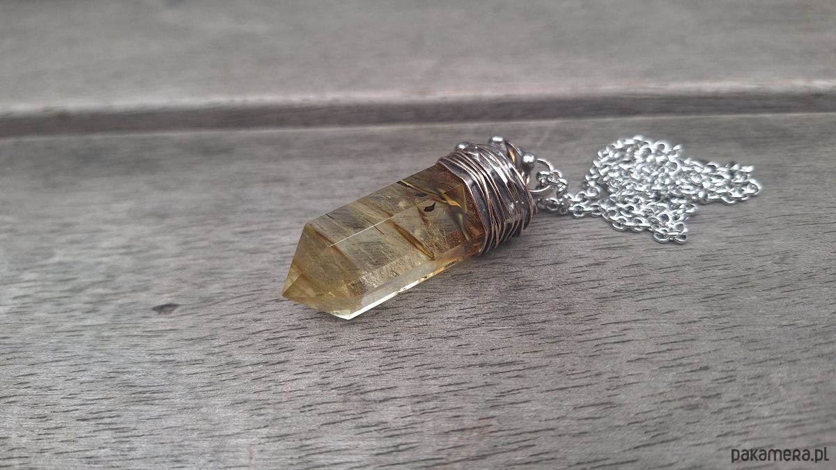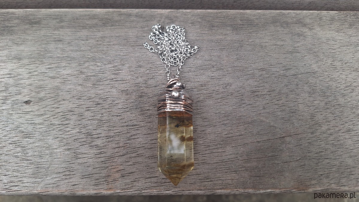 Wisiorek wykonany z miedzi, cyny i kwarcu. Wymiary ok. 5.5 na 1.8 cm. Zawieszony na łańcuszku o długości ok. 50 cm.