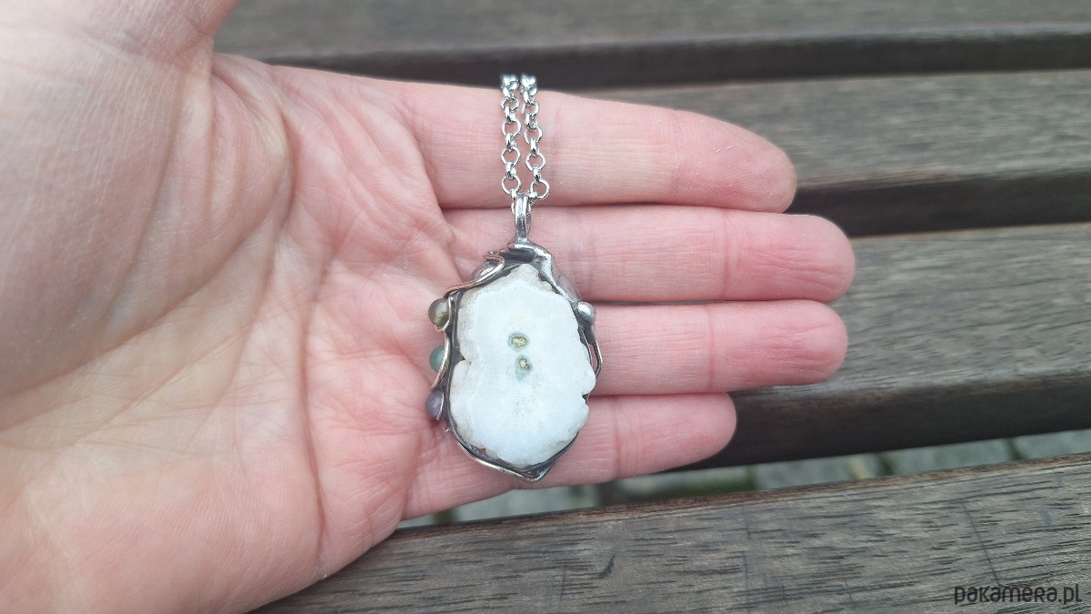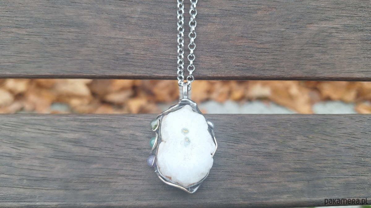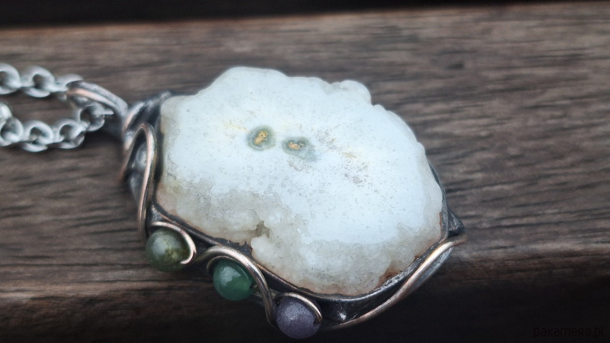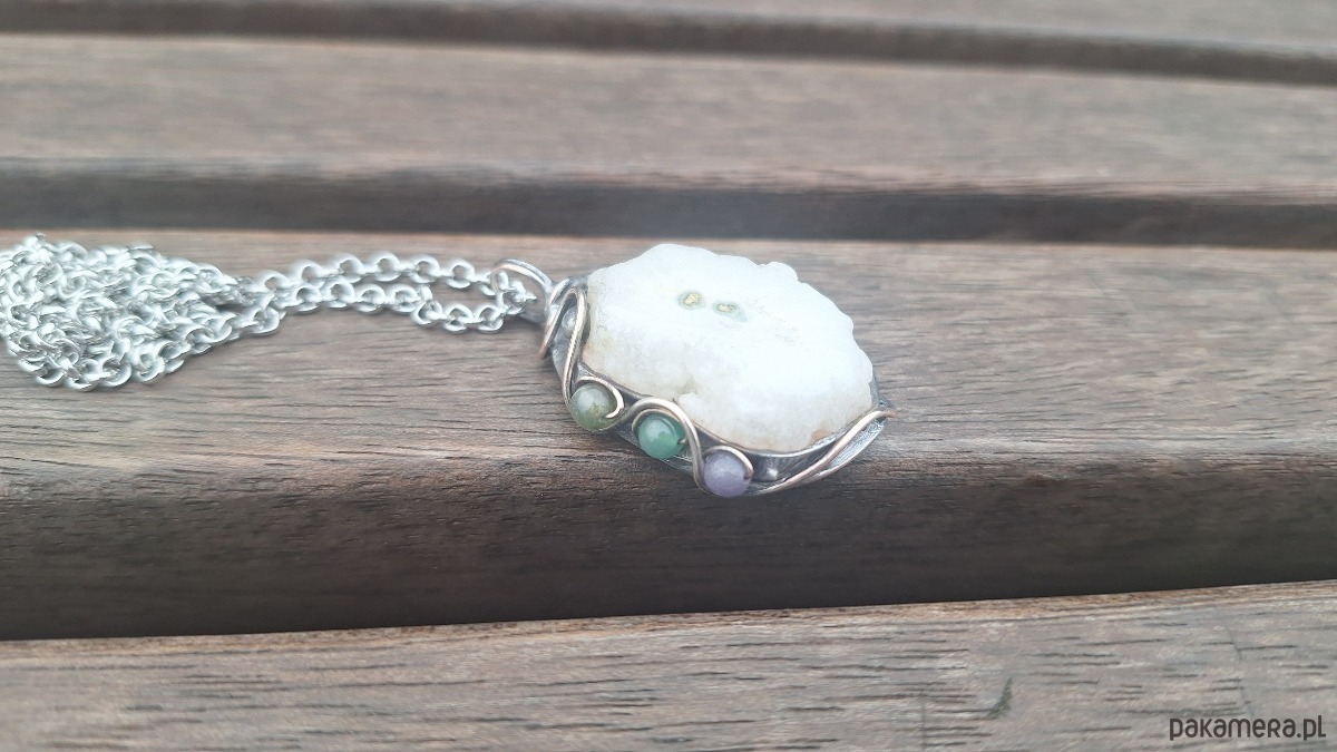 Wisiorek wykonany z miedzi, cyny, jadeitów i kwarcu. Wymiary ok. 3.5 na 2.5 cm. Zawieszony na łańcuszku o długości ok. 50 cm.
