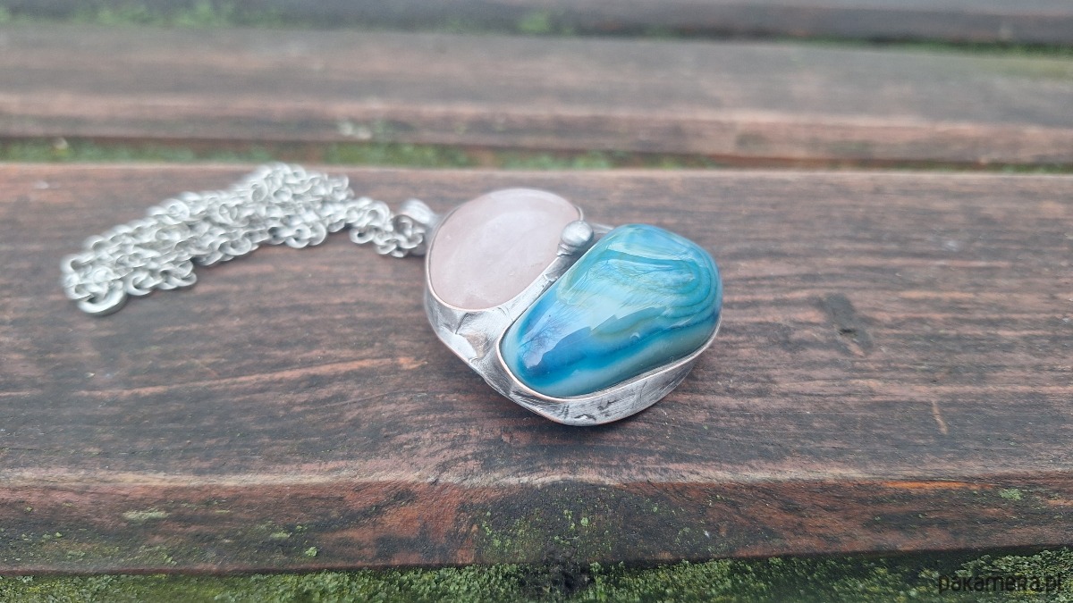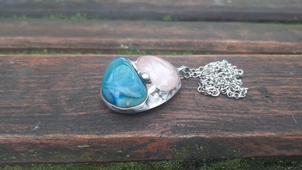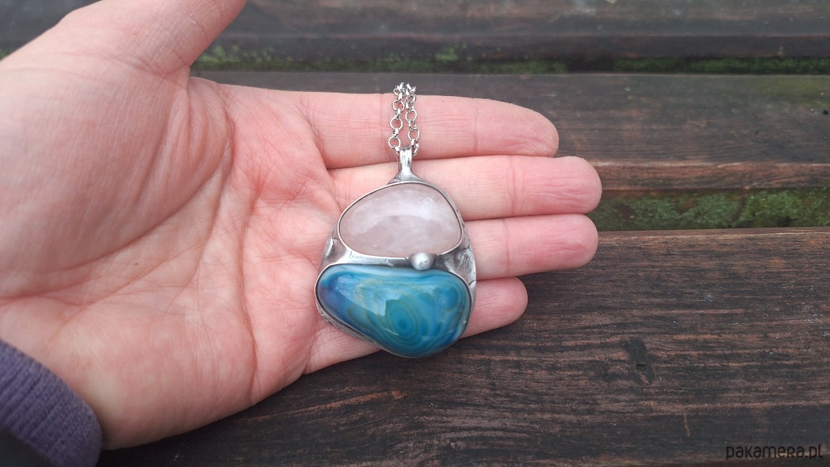 Wisiorek wykonany z miedzi, cyny, agatu i kwarcu. Wymiary ok. 4 na 3.5 cm. Zawieszony na łańcuszku o długości ok. 50 cm.