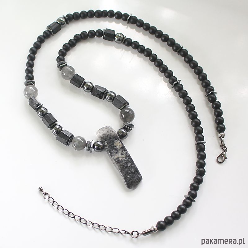Autorski naszyjnik z surowym kwarcem z rutylem, surowymi kostkami czarnego turmalinu, hematytami oraz labradorytami. Z intencją istnienia w esencji najwyższej jakości życia w każdej dziedzinie. Zapięcie antracyt z przedłużką.