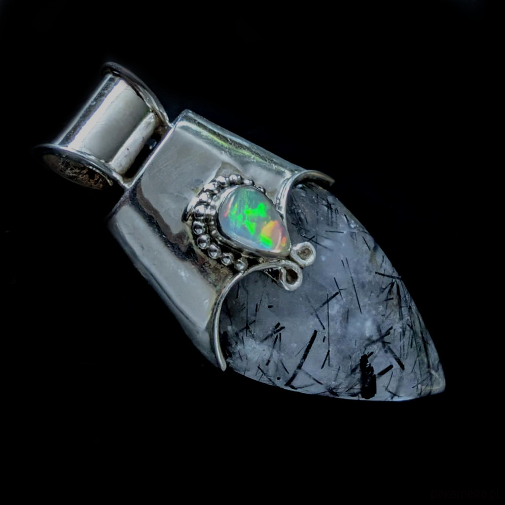 Oryginalny wisior wykonany ze srebra próby 925 oraz pięknego kwarcu z inkluzjami czarnego turmalinu. Koronę wisiora wienczy opal z Etiopii. Wymiary całego wisiora 56 x 26 mm, oprawa opalu 9 x 6 mm. Wisior waży 17,66 g. Wisior zostanie zapakowany w ozdobne pudełeczko. Wykonany przez dostawcę kamieni.