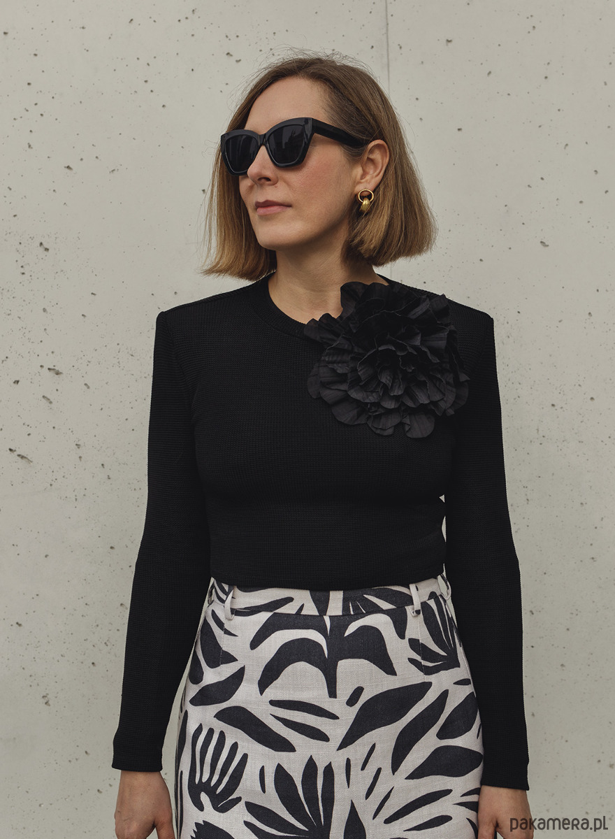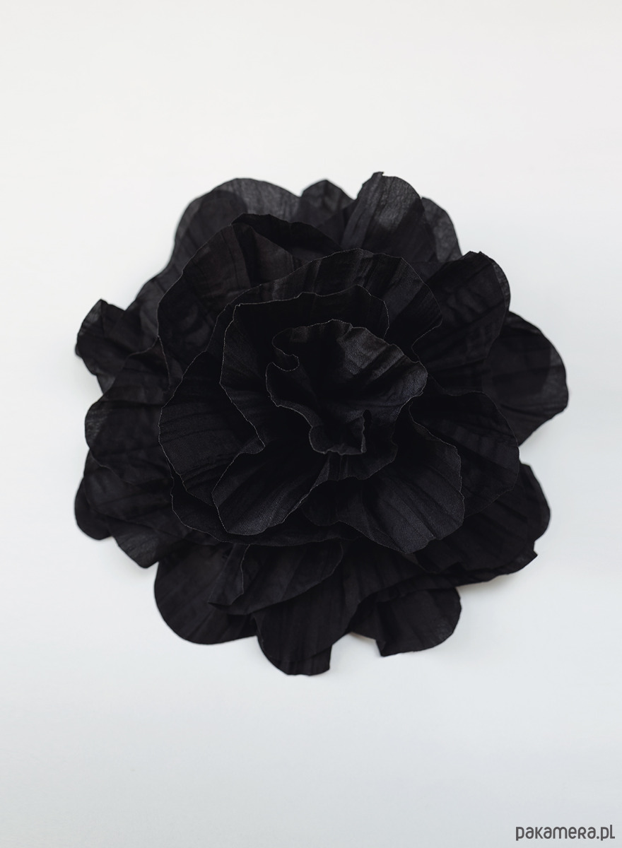 Ozdoba do odzieży w formie czarnego kwiatu zrobionego z tkaniny. Świetnie dopełni i nada charakteru każdej stylizacji. Przypinka z tyłu posiada dwa mocowania. Średnica 20cm