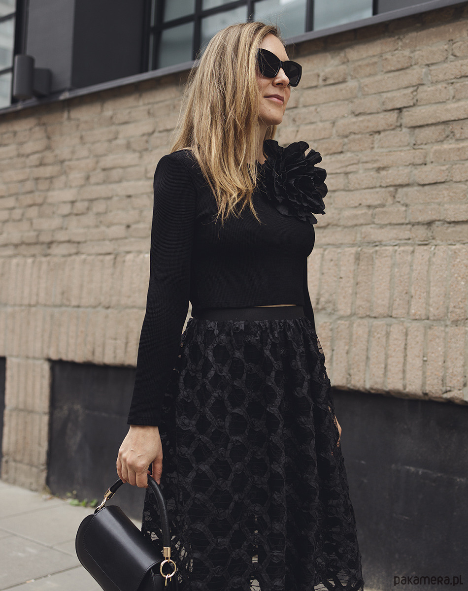 Ozdoba do odzieży w formie czarnego kwiatu zrobionego z tkaniny. Świetnie dopełni i nada charakteru każdej stylizacji. Przypinka z tyłu posiada dwa mocowania. Średnica 20cm